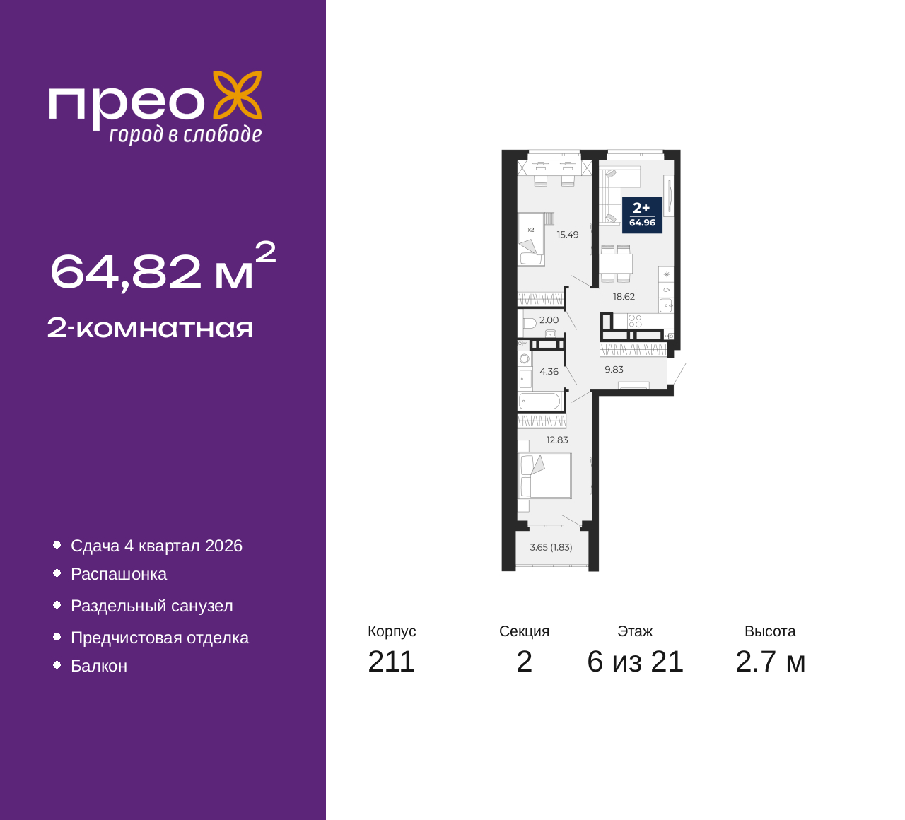 - Общая площадь 64.82 м²