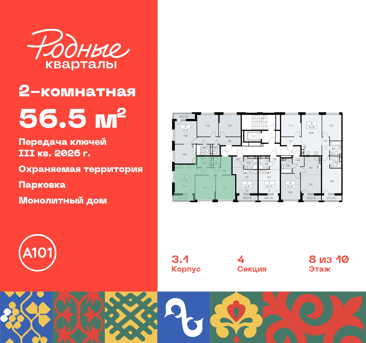 Двухкомнатная квартира от застройщика в ЖК "Родные кварталы" на 8 этаже. Квартира без отделки, после получения ключей можно делать ремонт. Общая площадь: 56.5 кв.м., жилая: 27.8 кв.м., площадь просторной кухни-столовой: 12.1 кв.м. Квартира угловая, идеально подойдет любителям тишины и панорамных видов. В квартире одна лоджия, один совмещенный и один раздельный санузел. Высота потолков 2.95 м. Дом монолитный, черырехподъездный, высотой 10 этажей. Квартира находится в 4-й секции в корпусе 3.1. На этаже 6 квартир. В подъезде 1 грузовой лифт. Начало строительства - 2 квартал 2024 года. Окончание строительства - 3 квартал 2026 года. Оформление сделки по договору долевого участия. Артикул квартиры по базе застройщика 96К-3.1-176. Новый жилой комплекс "Родные кварталы" строится в уютной, экологически благополучной локации на юго-западе столицы. В ближайшем окружении – ухоженные малоэтажные посёлки и живописный Ульяновский лесопарк. Благодаря этому из окон откроются вдохновляющие виды, которые не исчезнут со временем за фасадами многоэтажек. Через весь район пройдёт главный бульвар, который свяжет набережную, жилые кварталы и площади в единое дружелюбное пространство, органично наполненное узнаваемыми элементами культурных традиций разных народов. В жилом комплексе создаются условия для комфортного отдыха и занятий спортом всех жителей. Здесь можно прогуляться и отдохнуть в лесопарке на берегу ручья, позаниматься на тренажёрах под открытым небом и спортивных площадках. Для малышей построят игровые комплексы, развивающие силу, координацию и ловкость. Всего в жилом комплексе будет оборудовано 6 га территории для спокойного отдыха и около 9 га — для активного. Подъезды в домах освещены в любое время суток, входы и вестибюль хорошо просматриваются с улицы. Витражное остекление обеспечивает приток естественного света днём, а вечером зажигаются светильники. В отделке домов используется сочетание вентилируемого фасада с облицовкой из фибробетонной плитки и штукатуркой. Комфортная высота домов соразмерна человеку и в среднем составляет 10 этажей. Все дома обеспечены собственными подземными паркингами. В них размещаются машино-места и кладовые. В паркинг или кладовую можно спуститься на лифте или по лестнице. В комплексе появятся бытовые сервисы, магазины, аптеки и другие торгово-бытовые объекты. В жилом районе «Родные кварталы» будут построены: - образовательный центр: школа на 1300 учеников и детский сад на 250 малышей, - два детских сада на 200 мест каждый (один из них сдаётся в 1-й очереди). В транспортной доступности уже работают: - школа № 41 и детский сад — по Боровскому шоссе, - школа № 2057 и детский сад — на запад от района, в дер. Марушкино. ЖК «Родные кварталы» строится в Новомосковском округе столицы, в 15 минутах на автомобиле от аэропорта «Внуково». Район обеспечен удобными выездами на три крупные современные автотрассы. Здесь уже работает и активно развивается система наземного общественного транспорта, включая междугородние рейсы. Интенсивное развитие локации обеспечивают две действующие станции крупных транспортных линий: метро (станция «Внуково») и МЦД (станция «Толстопальцево»). (AQID02378348)