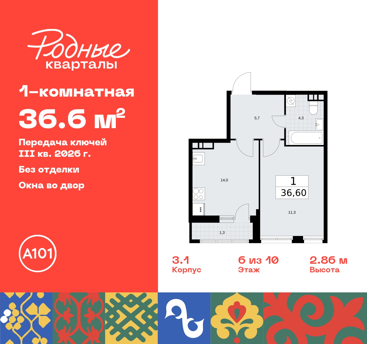 1-комн. квартира от застройщика в ЖК "Родные кварталы" на 6 этаже. Квартира без отделки, полностью готова к чистовой отделке и дальнейшему ремонту. Общая площадь: 36.6 кв.м., жилая: 14 кв.м., площадь просторной кухни-столовой: 11.3 кв.м. Все окна выходят на одну сторону. В квартире одна лоджия, один совмещенный санузел. Высота потолков 2.95 м. Дом монолитный, черырехподъездный, высотой 10 этажей. Квартира находится в 3-й секции в корпусе 3.1. На этаже 5 квартир. В подъезде 1 грузовой лифт. Начало строительства - 2 квартал 2024 года. Окончание строительства - 3 квартал 2026 года. Оформление сделки по договору долевого участия. Артикул квартиры по базе застройщика 96К-3.1-112. Новый жилой комплекс "Родные кварталы" строится в уютной, экологически благополучной локации на юго-западе столицы. В ближайшем окружении – ухоженные малоэтажные посёлки и живописный Ульяновский лесопарк. Благодаря этому из окон откроются вдохновляющие виды, которые не исчезнут со временем за фасадами многоэтажек. Через весь район пройдёт главный бульвар, который свяжет набережную, жилые кварталы и площади в единое дружелюбное пространство, органично наполненное узнаваемыми элементами культурных традиций разных народов. В жилом комплексе создаются условия для комфортного отдыха и занятий спортом всех жителей. Здесь можно прогуляться и отдохнуть в лесопарке на берегу ручья, позаниматься на тренажёрах под открытым небом и спортивных площадках. Для малышей построят игровые комплексы, развивающие силу, координацию и ловкость. Всего в жилом комплексе будет оборудовано 6 га территории для спокойного отдыха и около 9 га — для активного. Подъезды в домах освещены в любое время суток, входы и вестибюль хорошо просматриваются с улицы. Витражное остекление обеспечивает приток естественного света днём, а вечером зажигаются светильники. В отделке домов используется сочетание вентилируемого фасада с облицовкой из фибробетонной плитки и штукатуркой. Комфортная высота домов соразмерна человеку и в среднем составляет 10 этажей. Все дома обеспечены собственными подземными паркингами. В них размещаются машино-места и кладовые. В паркинг или кладовую можно спуститься на лифте или по лестнице. В комплексе появятся бытовые сервисы, магазины, аптеки и другие торгово-бытовые объекты. В жилом районе «Родные кварталы» будут построены: - образовательный центр: школа на 1300 учеников и детский сад на 250 малышей, - два детских сада на 200 мест каждый (один из них сдаётся в 1-й очереди). В транспортной доступности уже работают: - школа № 41 и детский сад — по Боровскому шоссе, - школа № 2057 и детский сад — на запад от района, в дер. Марушкино. ЖК «Родные кварталы» строится в Новомосковском округе столицы, в 15 минутах на автомобиле от аэропорта «Внуково». Район обеспечен удобными выездами на три крупные современные автотрассы. Здесь уже работает и активно развивается система наземного общественного транспорта, включая междугородние рейсы. Интенсивное развитие локации обеспечивают две действующие станции крупных транспортных линий: метро (станция «Внуково») и МЦД (станция «Толстопальцево»). (AQID02378285)