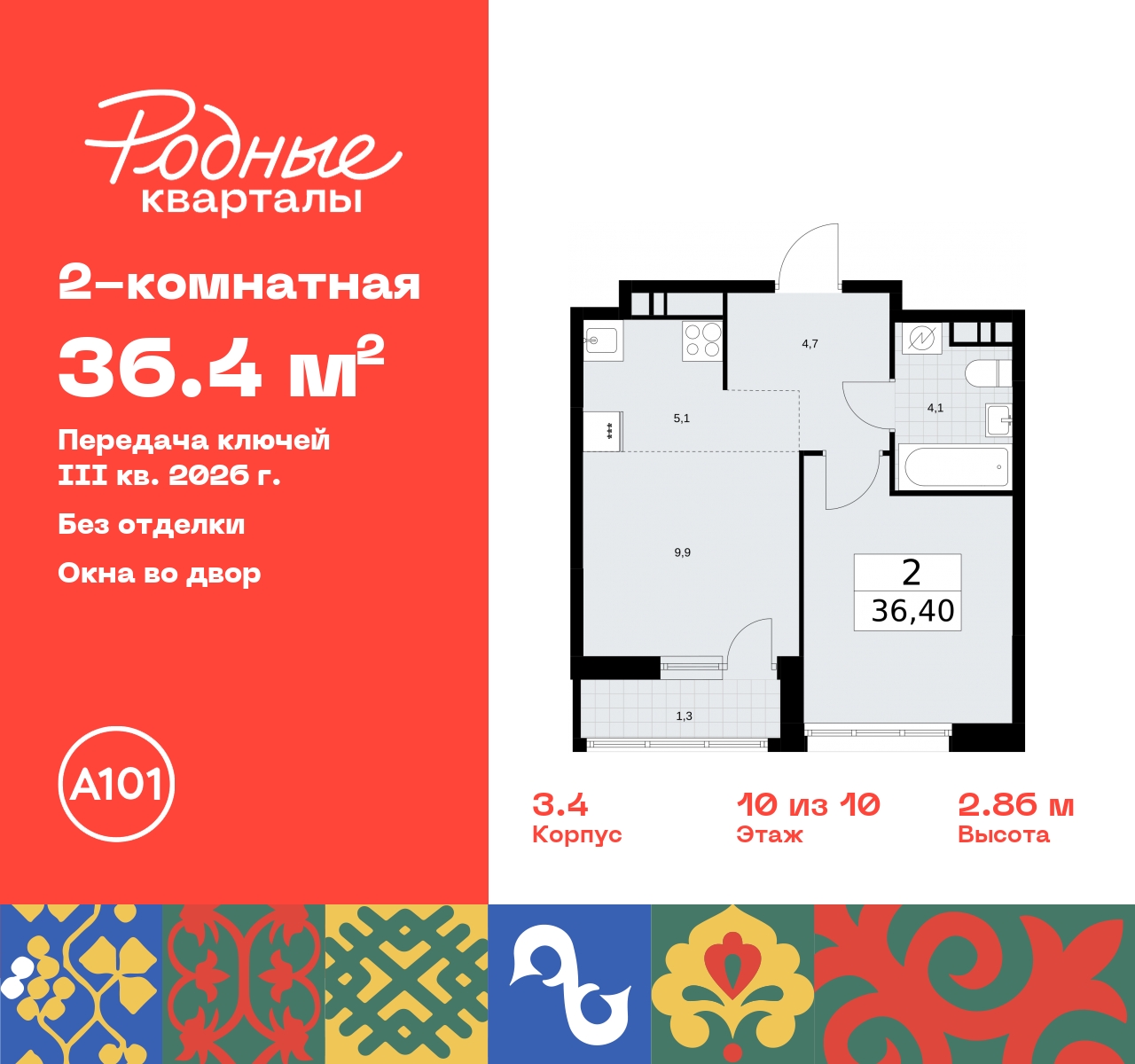 Просторная 2-комн. квартира с европланировкой в ЖК "Родные кварталы" на 10 этаже. Квартира без отделки, после получения ключей можно делать ремонт. Общая площадь: 36.4 кв.м., жилая: 21.2 кв.м., суммарная площадь гостиной-столовой с кухонной зоной: 15 кв.м. Европейская планировка, кухня-гостиная - идеальный вариант для тех, кто любит часто принимать гостей. Комнаты изолированные, все окна выходят на одну сторону. В квартире одна лоджия, один совмещенный санузел. Высота потолков 2.95 м. Квартира находится в корпусе 3.4. Дом монолитный, одноподъездный, высотой 10 этажей. На этаже 7 квартир. В подъезде 1 пассажирский и 1 грузовой лифт. Начало строительства - 2 квартал 2024 года. Окончание строительства - 3 квартал 2026 года. Оформление сделки по договору долевого участия. Артикул квартиры по базе застройщика 96К-3.4-530. Новый жилой комплекс "Родные кварталы" строится в уютной, экологически благополучной локации на юго-западе столицы. В ближайшем окружении – ухоженные малоэтажные посёлки и живописный Ульяновский лесопарк. Благодаря этому из окон откроются вдохновляющие виды, которые не исчезнут со временем за фасадами многоэтажек. Через весь район пройдёт главный бульвар, который свяжет набережную, жилые кварталы и площади в единое дружелюбное пространство, органично наполненное узнаваемыми элементами культурных традиций разных народов. В жилом комплексе создаются условия для комфортного отдыха и занятий спортом всех жителей. Здесь можно прогуляться и отдохнуть в лесопарке на берегу ручья, позаниматься на тренажёрах под открытым небом и спортивных площадках. Для малышей построят игровые комплексы, развивающие силу, координацию и ловкость. Всего в жилом комплексе будет оборудовано 6 га территории для спокойного отдыха и около 9 га — для активного. Подъезды в домах освещены в любое время суток, входы и вестибюль хорошо просматриваются с улицы. Витражное остекление обеспечивает приток естественного света днём, а вечером зажигаются светильники. В отделке домов используется сочетание вентилируемого фасада с облицовкой из фибробетонной плитки и штукатуркой. Комфортная высота домов соразмерна человеку и в среднем составляет 10 этажей. Все дома обеспечены собственными подземными паркингами. В них размещаются машино-места и кладовые. В паркинг или кладовую можно спуститься на лифте или по лестнице. В комплексе появятся бытовые сервисы, магазины, аптеки и другие торгово-бытовые объекты. В жилом районе «Родные кварталы» будут построены: - образовательный центр: школа на 1300 учеников и детский сад на 250 малышей, - два детских сада на 200 мест каждый (один из них сдаётся в 1-й очереди). В транспортной доступности уже работают: - школа № 41 и детский сад — по Боровскому шоссе, - школа № 2057 и детский сад — на запад от района, в дер. Марушкино. ЖК «Родные кварталы» строится в Новомосковском округе столицы, в 15 минутах на автомобиле от аэропорта «Внуково». Район обеспечен удобными выездами на три крупные современные автотрассы. Здесь уже работает и активно развивается система наземного общественного транспорта, включая междугородние рейсы. Интенсивное развитие локации обеспечивают две действующие станции крупных транспортных линий: метро (станция «Внуково») и МЦД (станция «Толстопальцево»). (AQID02378699)