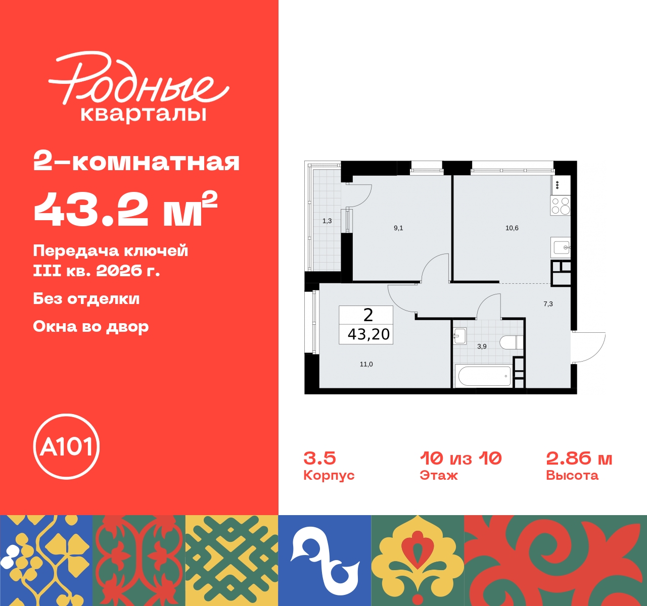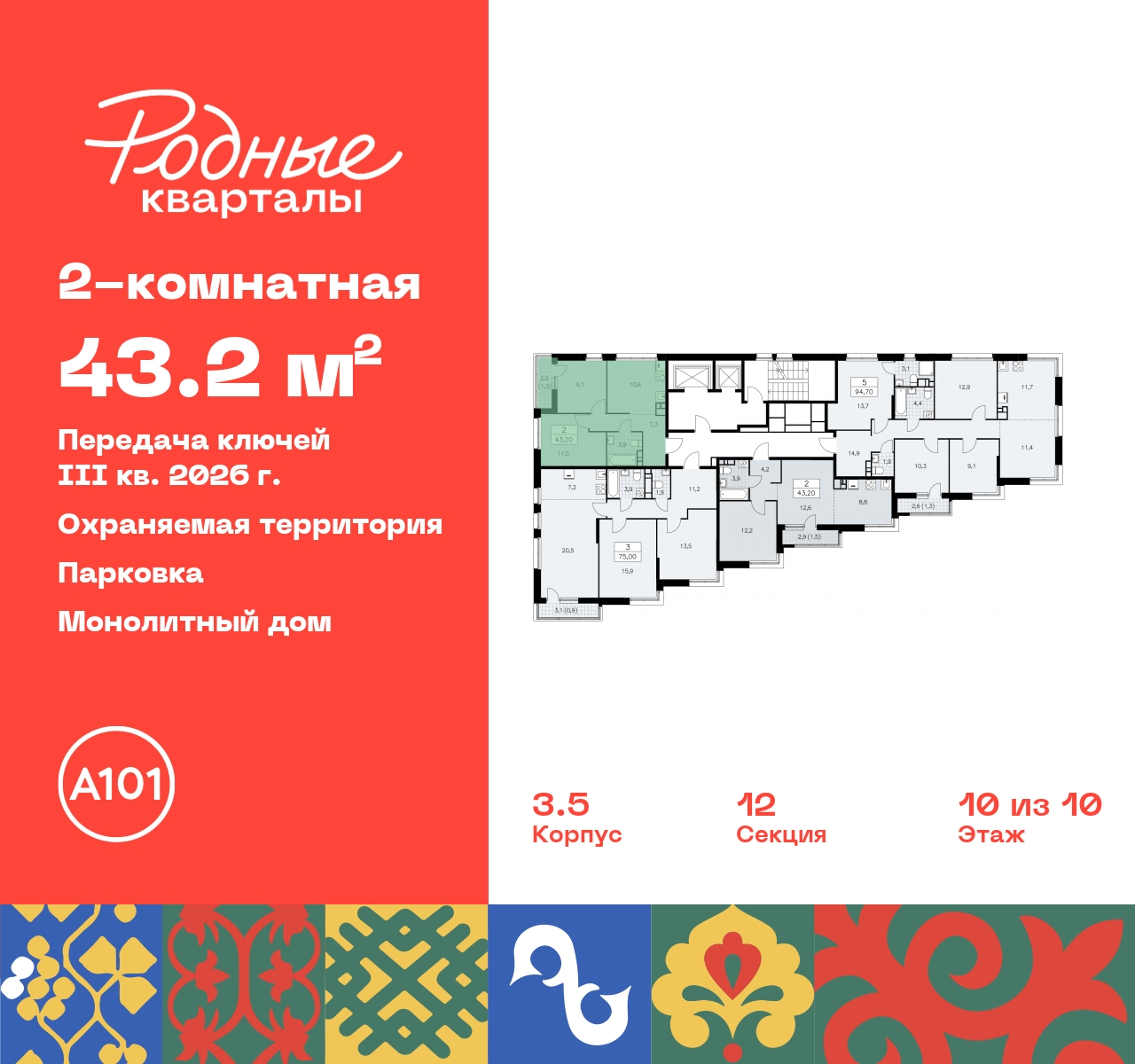 Двухкомнатная квартира с европланировкой от застройщика в ЖК "Родные кварталы" на 10 этаже. Квартира без отделки, полностью готова к ремонту. Общая площадь: 43.2 кв.м., жилая: 24.8 кв.м., суммарная площадь гостиной-столовой с кухонной зоной: 21.4 кв.м. Европланировка, зона гостиной комнаты объединена с кухней. Комнаты изолированные, все окна выходят на одну сторону. В квартире одна лоджия, один совмещенный санузел. Высота потолков 2.95 м. Квартира находится в корпусе 3.5. Дом монолитный, одноподъездный, высотой 10 этажей. На этаже 4 квартиры. В подъезде 1 пассажирский и 1 грузовой лифт. Начало строительства - 2 квартал 2024 года. Окончание строительства - 3 квартал 2026 года. Оформление сделки по договору долевого участия. Артикул квартиры по базе застройщика 96К-3.5-570. Новый жилой комплекс "Родные кварталы" строится в уютной, экологически благополучной локации на юго-западе столицы. В ближайшем окружении – ухоженные малоэтажные посёлки и живописный Ульяновский лесопарк. Благодаря этому из окон откроются вдохновляющие виды, которые не исчезнут со временем за фасадами многоэтажек. Через весь район пройдёт главный бульвар, который свяжет набережную, жилые кварталы и площади в единое дружелюбное пространство, органично наполненное узнаваемыми элементами культурных традиций разных народов. В жилом комплексе создаются условия для комфортного отдыха и занятий спортом всех жителей. Здесь можно прогуляться и отдохнуть в лесопарке на берегу ручья, позаниматься на тренажёрах под открытым небом и спортивных площадках. Для малышей построят игровые комплексы, развивающие силу, координацию и ловкость. Всего в жилом комплексе будет оборудовано 6 га территории для спокойного отдыха и около 9 га — для активного. Подъезды в домах освещены в любое время суток, входы и вестибюль хорошо просматриваются с улицы. Витражное остекление обеспечивает приток естественного света днём, а вечером зажигаются светильники. В отделке домов используется сочетание вентилируемого фасада с облицовкой из фибробетонной плитки и штукатуркой. Комфортная высота домов соразмерна человеку и в среднем составляет 10 этажей. Все дома обеспечены собственными подземными паркингами. В них размещаются машино-места и кладовые. В паркинг или кладовую можно спуститься на лифте или по лестнице. В комплексе появятся бытовые сервисы, магазины, аптеки и другие торгово-бытовые объекты. В жилом районе «Родные кварталы» будут построены: - образовательный центр: школа на 1300 учеников и детский сад на 250 малышей, - два детских сада на 200 мест каждый (один из них сдаётся в 1-й очереди). В транспортной доступности уже работают: - школа № 41 и детский сад — по Боровскому шоссе, - школа № 2057 и детский сад — на запад от района, в дер. Марушкино. ЖК «Родные кварталы» строится в Новомосковском округе столицы, в 15 минутах на автомобиле от аэропорта «Внуково». Район обеспечен удобными выездами на три крупные современные автотрассы. Здесь уже работает и активно развивается система наземного общественного транспорта, включая междугородние рейсы. Интенсивное развитие локации обеспечивают две действующие станции крупных транспортных линий: метро (станция «Внуково») и МЦД (станция «Толстопальцево»). (AQID02378741)