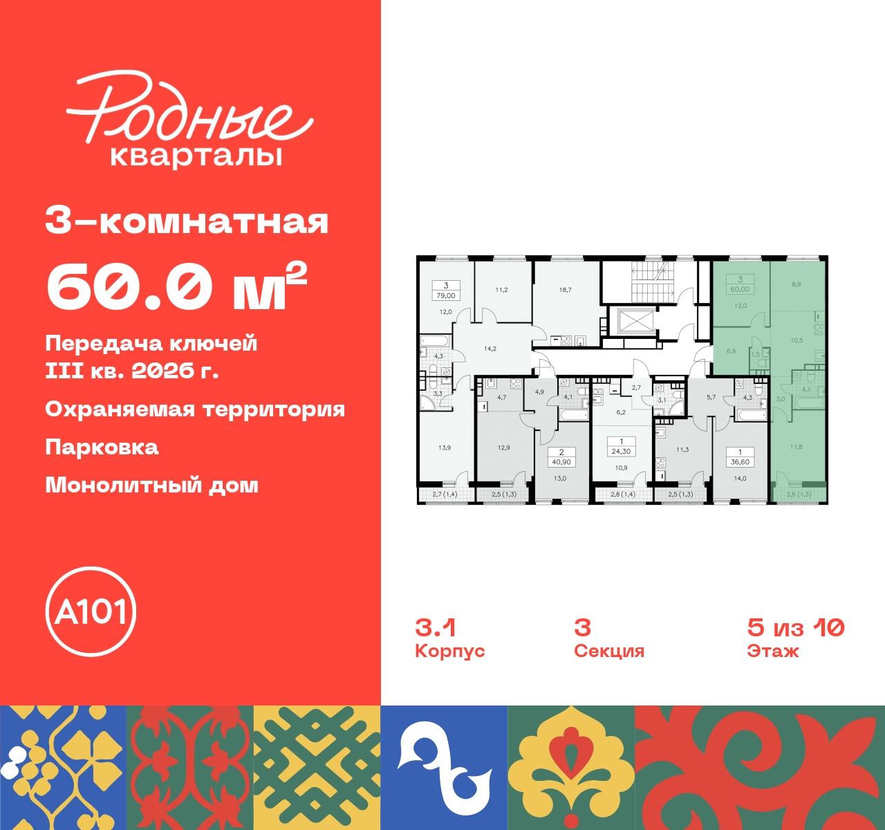 Продается трехкомнатная квартира с европланировкой в ЖК "Родные кварталы" на 5 этаже. Квартира без отделки, новый собственник может сделать ремонт по индивидуальному дизайн-проекту. Общая площадь: 60 кв.м., жилая: 32.6 кв.м., общая площадь гостиной-столовой с кухонной зоной: 18.6 кв.м. Европейская планировка, кухня и гостиная объединены в одно просторное помещение. Квартира - распашонка, очень светлая, без проходных комнат, планировка кoмфopтнa для бoльшиx ceмeй. В квартире один балкон, один совмещенный и один раздельный санузел. Высота потолков 2.95 м. Дом монолитный, черырехподъездный, высотой 10 этажей. Квартира находится в 3-й секции в корпусе 3.1. На этаже 5 квартир. В подъезде 1 грузовой лифт. Начало строительства - 2 квартал 2024 года. Окончание строительства - 3 квартал 2026 года. Оформление сделки по договору долевого участия. Артикул квартиры по базе застройщика 96К-3.1-106. Новый жилой комплекс "Родные кварталы" строится в уютной, экологически благополучной локации на юго-западе столицы. В ближайшем окружении – ухоженные малоэтажные посёлки и живописный Ульяновский лесопарк. Благодаря этому из окон откроются вдохновляющие виды, которые не исчезнут со временем за фасадами многоэтажек. Через весь район пройдёт главный бульвар, который свяжет набережную, жилые кварталы и площади в единое дружелюбное пространство, органично наполненное узнаваемыми элементами культурных традиций разных народов. В жилом комплексе создаются условия для комфортного отдыха и занятий спортом всех жителей. Здесь можно прогуляться и отдохнуть в лесопарке на берегу ручья, позаниматься на тренажёрах под открытым небом и спортивных площадках. Для малышей построят игровые комплексы, развивающие силу, координацию и ловкость. Всего в жилом комплексе будет оборудовано 6 га территории для спокойного отдыха и около 9 га — для активного. Подъезды в домах освещены в любое время суток, входы и вестибюль хорошо просматриваются с улицы. Витражное остекление обеспечивает приток естественного света днём, а вечером зажигаются светильники. В отделке домов используется сочетание вентилируемого фасада с облицовкой из фибробетонной плитки и штукатуркой. Комфортная высота домов соразмерна человеку и в среднем составляет 10 этажей. Все дома обеспечены собственными подземными паркингами. В них размещаются машино-места и кладовые. В паркинг или кладовую можно спуститься на лифте или по лестнице. В комплексе появятся бытовые сервисы, магазины, аптеки и другие торгово-бытовые объекты. В жилом районе «Родные кварталы» будут построены: - образовательный центр: школа на 1300 учеников и детский сад на 250 малышей, - два детских сада на 200 мест каждый (один из них сдаётся в 1-й очереди). В транспортной доступности уже работают: - школа № 41 и детский сад — по Боровскому шоссе, - школа № 2057 и детский сад — на запад от района, в дер. Марушкино. ЖК «Родные кварталы» строится в Новомосковском округе столицы, в 15 минутах на автомобиле от аэропорта «Внуково». Район обеспечен удобными выездами на три крупные современные автотрассы. Здесь уже работает и активно развивается система наземного общественного транспорта, включая междугородние рейсы. Интенсивное развитие локации обеспечивают две действующие станции крупных транспортных линий: метро (станция «Внуково») и МЦД (станция «Толстопальцево»). (AQID02378279)