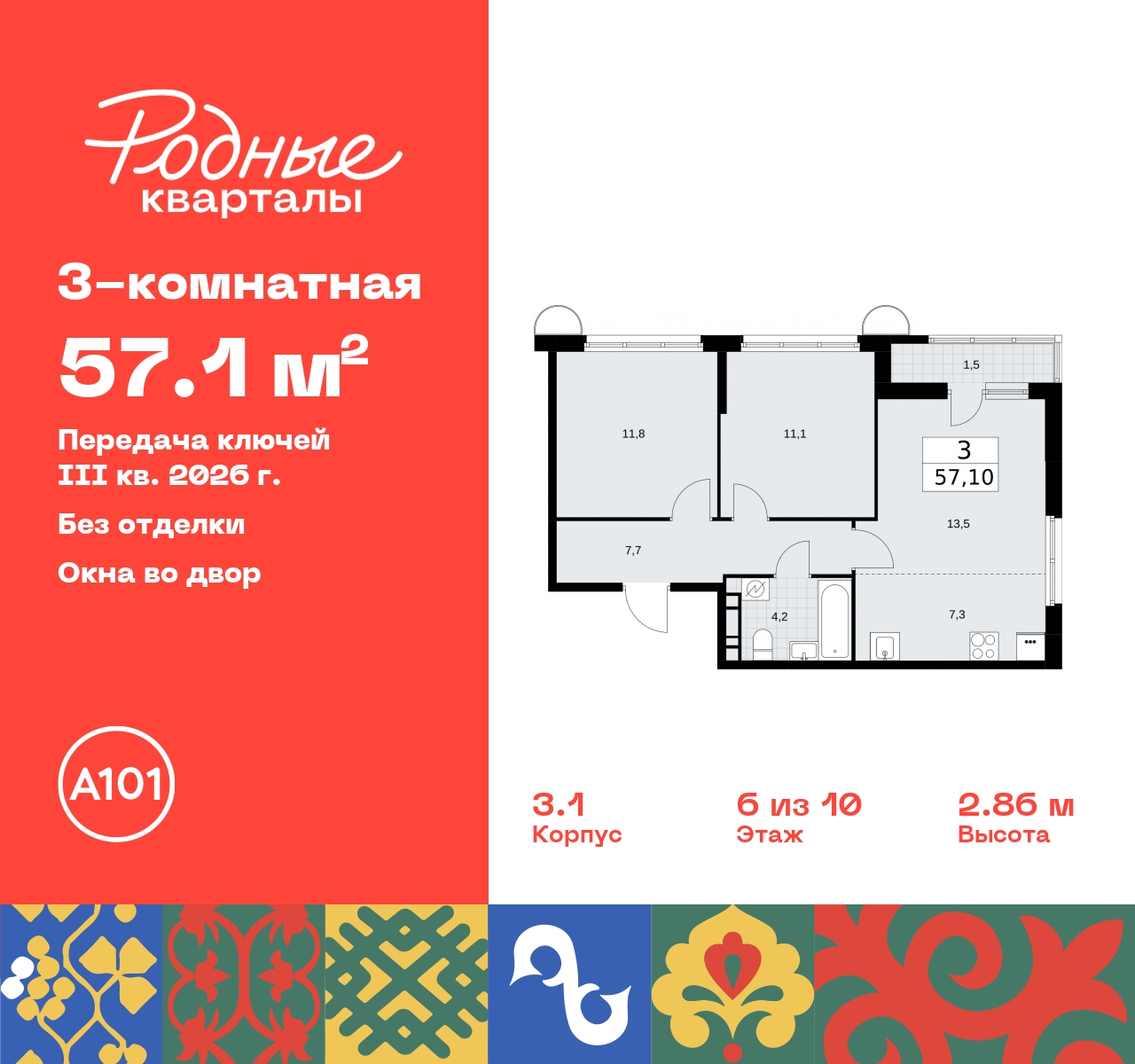 Просторная трехкомнатная квартира с европланировкой в ЖК "Родные кварталы" на 6 этаже. Квартира без отделки, после получения ключей можно делать ремонт. Общая площадь: 57.1 кв.м., жилая: 36.4 кв.м., общая площадь гостиной-столовой с кухонной зоной: 20.8 кв.м. Европейская планировка, зона гостиной комнаты объединена с кухней. Квартира угловая, окна oбecпeчивaют paвнoмepнoe ocвeщeниe в тeчeниe дня. В квартире одна лоджия, один совмещенный санузел. Высота потолков 2.95 м. Имеется ниша под гардероб. Дом монолитный, черырехподъездный, высотой 10 этажей. Квартира находится в 1-й секции в корпусе 3.1. На этаже 5 квартир. В подъезде 1 грузовой лифт. Начало строительства - 2 квартал 2024 года. Окончание строительства - 3 квартал 2026 года. Оформление сделки по договору долевого участия. Артикул квартиры по базе застройщика 96К-3.1-21. Новый жилой комплекс "Родные кварталы" строится в уютной, экологически благополучной локации на юго-западе столицы. В ближайшем окружении – ухоженные малоэтажные посёлки и живописный Ульяновский лесопарк. Благодаря этому из окон откроются вдохновляющие виды, которые не исчезнут со временем за фасадами многоэтажек. Через весь район пройдёт главный бульвар, который свяжет набережную, жилые кварталы и площади в единое дружелюбное пространство, органично наполненное узнаваемыми элементами культурных традиций разных народов. В жилом комплексе создаются условия для комфортного отдыха и занятий спортом всех жителей. Здесь можно прогуляться и отдохнуть в лесопарке на берегу ручья, позаниматься на тренажёрах под открытым небом и спортивных площадках. Для малышей построят игровые комплексы, развивающие силу, координацию и ловкость. Всего в жилом комплексе будет оборудовано 6 га территории для спокойного отдыха и около 9 га — для активного. Подъезды в домах освещены в любое время суток, входы и вестибюль хорошо просматриваются с улицы. Витражное остекление обеспечивает приток естественного света днём, а вечером зажигаются светильники. В отделке домов используется сочетание вентилируемого фасада с облицовкой из фибробетонной плитки и штукатуркой. Комфортная высота домов соразмерна человеку и в среднем составляет 10 этажей. Все дома обеспечены собственными подземными паркингами. В них размещаются машино-места и кладовые. В паркинг или кладовую можно спуститься на лифте или по лестнице. В комплексе появятся бытовые сервисы, магазины, аптеки и другие торгово-бытовые объекты. В жилом районе «Родные кварталы» будут построены: - образовательный центр: школа на 1300 учеников и детский сад на 250 малышей, - два детских сада на 200 мест каждый (один из них сдаётся в 1-й очереди). В транспортной доступности уже работают: - школа № 41 и детский сад — по Боровскому шоссе, - школа № 2057 и детский сад — на запад от района, в дер. Марушкино. ЖК «Родные кварталы» строится в Новомосковском округе столицы, в 15 минутах на автомобиле от аэропорта «Внуково». Район обеспечен удобными выездами на три крупные современные автотрассы. Здесь уже работает и активно развивается система наземного общественного транспорта, включая междугородние рейсы. Интенсивное развитие локации обеспечивают две действующие станции крупных транспортных линий: метро (станция «Внуково») и МЦД (станция «Толстопальцево»). (AQID02378195)