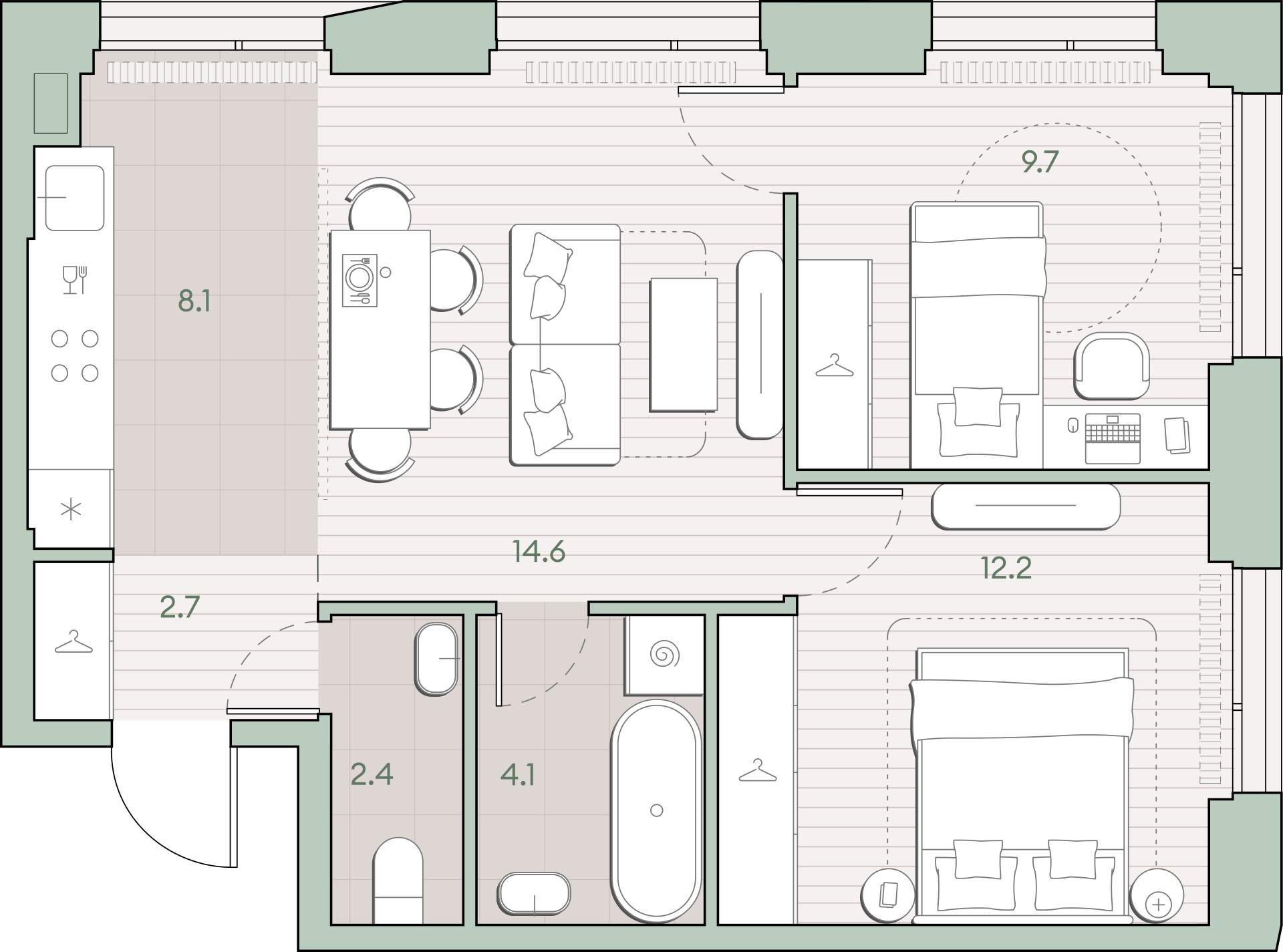 - Площадь кухни 8.1 м²