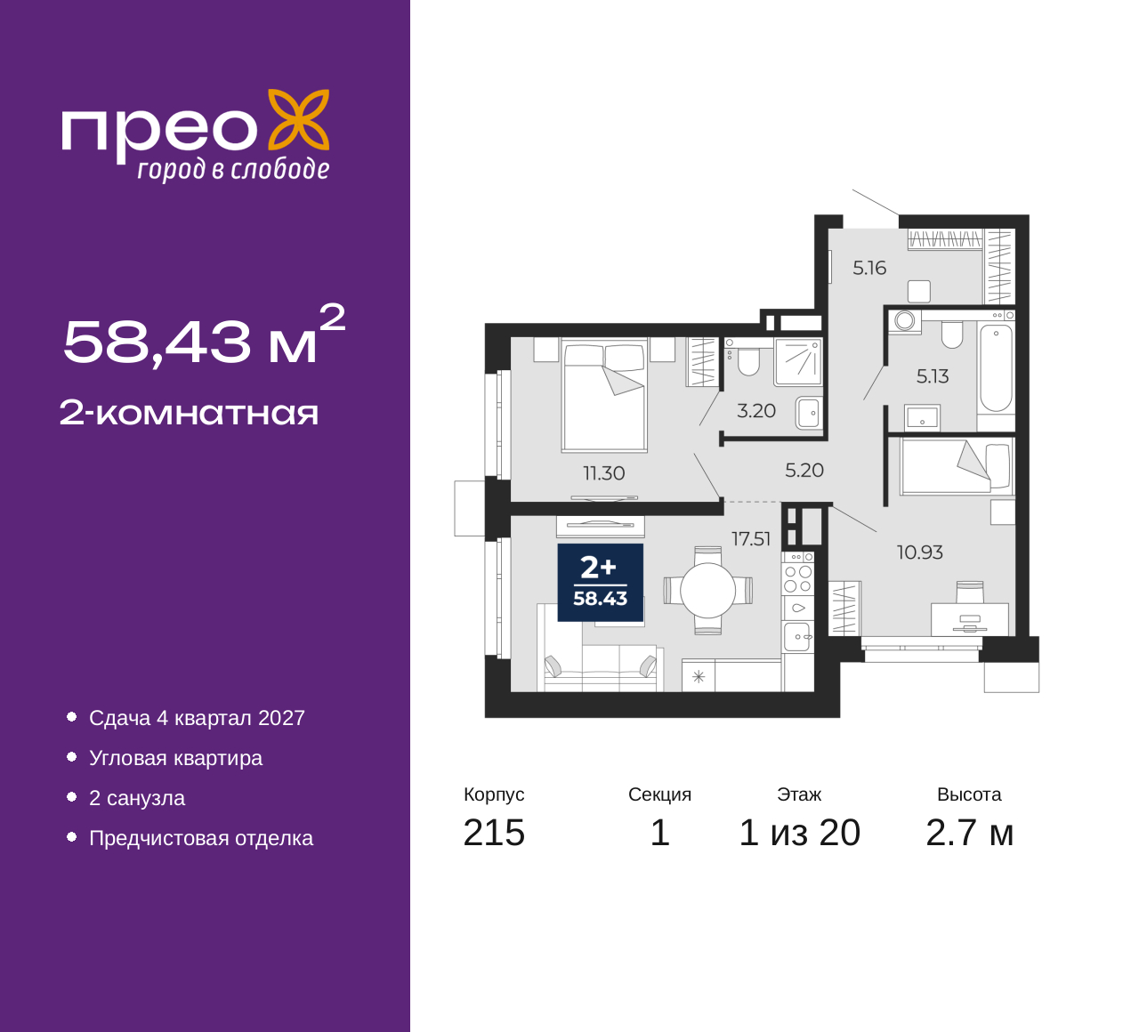- Общая площадь 58.43 м²