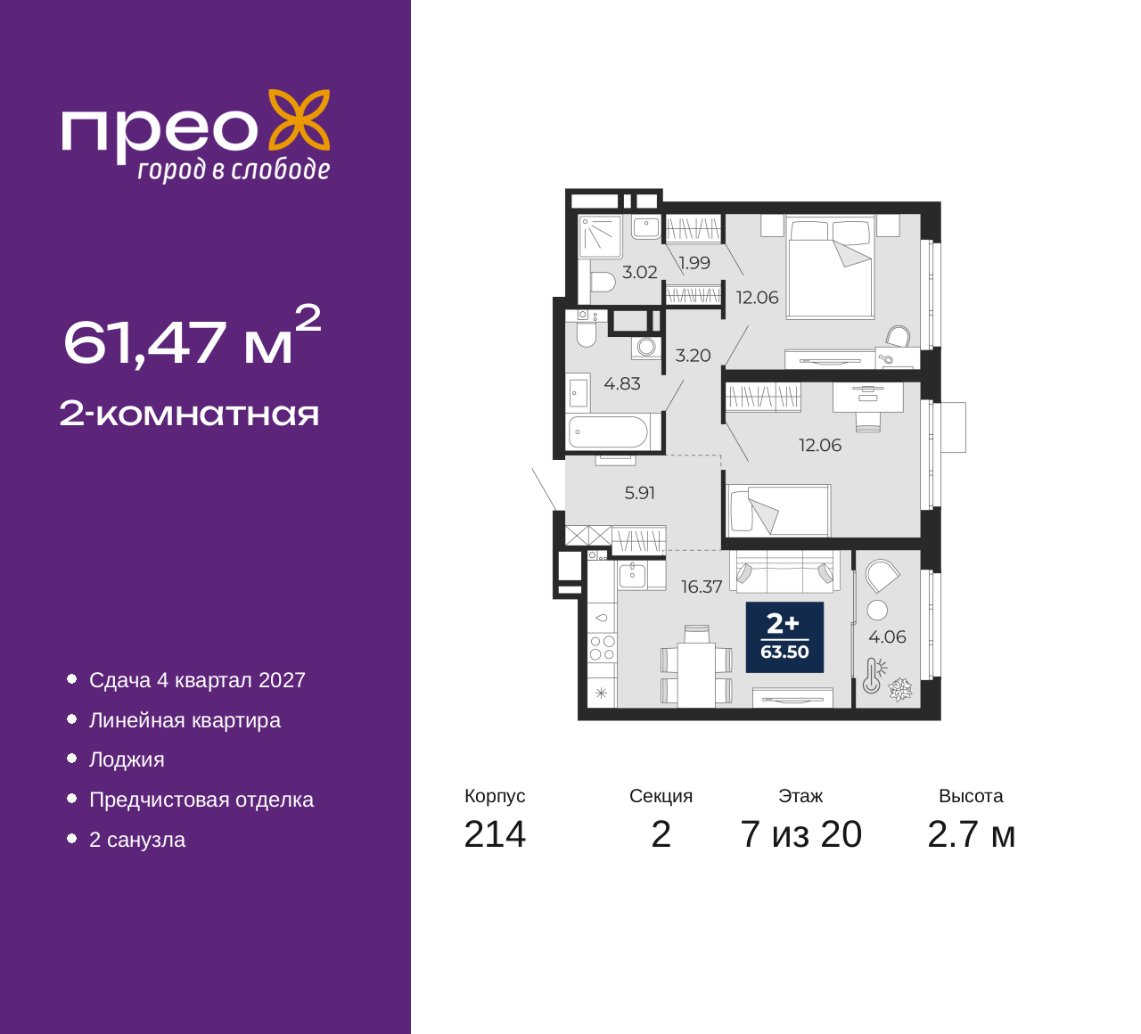 Просторная 2-комн. квартира с предчистовой отделкой в ЖК "Прео" на 7 этаже. Общая площадь: 61.47 кв.м., жилая: 24.12 кв.м., площадь просторной кухни-столовой: 16.37 кв.м. Комнаты изолированные, все окна выходят на одну сторону. В квартире одна лоджия, два совмещенных санузла. Высота потолков 2.7 м. Дом монолитный, двухподъездный, переменной этажности, от 12 до 20 этажей. Квартира находится во 2-й секции высотой 20 этажей в корпусе 214. На этаже 8 квартир. В подъезде 1 пассажирский и 1 грузовой лифт. Окончание строительства - 4 квартал 2027 года. Оформление сделки по договору долевого участия. Преображенский — один из самых привлекательных районов для жизни! Это полностью самостоятельный жилой район с точки зрения инфраструктуры. Преображенский находится между Московским и Червишевским трактами в квартале улиц Закалужская — Вьюжная — Александра Протозанова. Не нужно ждать, когда появится инфраструктура — переезжайте на всё готовое. Вблизи расположены действующие школа и детский сад. В этом году откроется еще один сад, а в следующем году — школа. По соседству с Преображенским запланировано строительство городского парка «Комарово» площадью 38 гектар. За 10 минут можно доехать на автомобиле до крупных ТРЦ: «Лента», «Кристалл», «Леруа Мерлен», «Метро» и «Ашан». С 2018 года в районе открыт Соседский центр — пространство, созданное для формирования добрососедской среды, совместного досуга, общения и реализации соседских инициатив. Здесь проходят встречи соседей, а также сами жители района организовывают мероприятия. Организатором такого события может стать любой желающий. В квартирах выполнена качественная предчистовая отделка. Гладкие стены с финишным выравниванием по маякам. Ровный потолок для установки натяжного потолка. Установлены пятикамерные окна с двойным стеклопакетом (3 стекла). Дизайнерские холлы с видеонаблюдением, безбарьерным и прозрачным входом – всегда светло и спокойно. На первом этаже есть просторные колясочные, где все жители могут оставлять свои коляски и велосипеды. В Преображенском есть всё, что нужно для активного отдыха и занятий спортом. Мы сделали большое футбольное поле с безопасным покрытием. Также установили хоккейный корт, который оборудован по всем необходимым стандартам. Во дворах можно делать упражнения на специальных площадках с турниками. Весь район мы обустроили велодорожками, которые связаны в единый маршрут. У нас есть сухие фонтаны, бьющие из земли, деревья, веревки, сетки, скалодром, газон, песок и резинка — осталось просто дать своему ребенку право на свободную игру. По-настоящему хорошие дворы — это те, которые дети предпочитают соцсетям и телевизору. Аккредитация в банках: ОАО «Альфа-Банк», «Сбербанк России», ПАО «Банк Уралсиб», ПАО «Газпромбанк», ПАО Банк «ВТБ» и других. (AQID02526010)