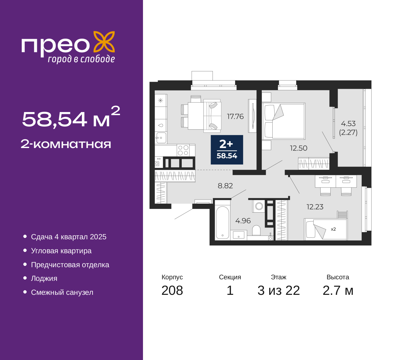 Продается 2-комн. квартира с предчистовой отделкой в ЖК "Прео" на 3 этаже. Общая площадь: 58.54 кв.м., жилая: 24.73 кв.м., площадь просторной кухни-столовой: 17.76 кв.м. Угловая квартира, окна oбecпeчивaют paвнoмepнoe ocвeщeниe в тeчeниe дня. В квартире одна лоджия, один совмещенный санузел. Высота потолков 2.7 м. Дом монолитный, трехподъездный, переменной этажности, от 14 до 22 этажей. Квартира находится в 1-й секции высотой 22 этажа в корпусе 208. На этаже 8 квартир. В подъезде 1 пассажирский и 1 грузовой лифт. Окончание строительства - 4 квартал 2025 года. Оформление сделки по договору долевого участия. Преображенский — один из самых привлекательных районов для жизни! Это полностью самостоятельный жилой район с точки зрения инфраструктуры. Преображенский находится между Московским и Червишевским трактами в квартале улиц Закалужская — Вьюжная — Александра Протозанова. Не нужно ждать, когда появится инфраструктура — переезжайте на всё готовое. Вблизи расположены действующие школа и детский сад. В этом году откроется еще один сад, а в следующем году — школа. По соседству с Преображенским запланировано строительство городского парка «Комарово» площадью 38 гектар. За 10 минут можно доехать на автомобиле до крупных ТРЦ: «Лента», «Кристалл», «Леруа Мерлен», «Метро» и «Ашан». С 2018 года в районе открыт Соседский центр — пространство, созданное для формирования добрососедской среды, совместного досуга, общения и реализации соседских инициатив. Здесь проходят встречи соседей, а также сами жители района организовывают мероприятия. Организатором такого события может стать любой желающий. В квартирах выполнена качественная предчистовая отделка. Гладкие стены с финишным выравниванием по маякам. Ровный потолок для установки натяжного потолка. Установлены пятикамерные окна с двойным стеклопакетом (3 стекла). Дизайнерские холлы с видеонаблюдением, безбарьерным и прозрачным входом – всегда светло и спокойно. На первом этаже есть просторные колясочные, где все жители могут оставлять свои коляски и велосипеды. В Преображенском есть всё, что нужно для активного отдыха и занятий спортом. Мы сделали большое футбольное поле с безопасным покрытием. Также установили хоккейный корт, который оборудован по всем необходимым стандартам. Во дворах можно делать упражнения на специальных площадках с турниками. Весь район мы обустроили велодорожками, которые связаны в единый маршрут. У нас есть сухие фонтаны, бьющие из земли, деревья, веревки, сетки, скалодром, газон, песок и резинка — осталось просто дать своему ребенку право на свободную игру. По-настоящему хорошие дворы — это те, которые дети предпочитают соцсетям и телевизору. Аккредитация в банках: «Сбербанк России», ПАО «Банк Уралсиб», ПАО «Газпромбанк», ПАО Банк «ВТБ», ОАО «Альфа-Банк» и других. (AQID02483766)