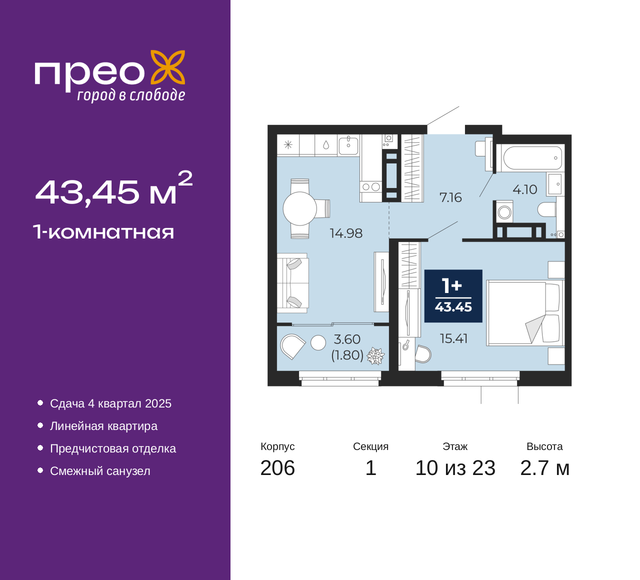 1-комн. квартира с предчистовой отделкой в ЖК "Прео" на 10 этаже. Общая площадь: 43.45 кв.м., жилая: 15.41 кв.м., площадь просторной кухни-столовой: 14.98 кв.м. Все окна выходят на одну сторону. В квартире один совмещенный санузел. Высота потолков 2.7 м. Дом монолитный, трехподъездный, переменной этажности, от 14 до 23 этажей. Квартира находится в 1-й секции высотой 23 этажа в корпусе 206. На этаже 8 квартир. В подъезде 1 пассажирский и 1 грузовой лифт. Окончание строительства - 4 квартал 2025 года. Оформление сделки по договору долевого участия. Преображенский — один из самых привлекательных районов для жизни! Это полностью самостоятельный жилой район с точки зрения инфраструктуры. Преображенский находится между Московским и Червишевским трактами в квартале улиц Закалужская — Вьюжная — Александра Протозанова. Не нужно ждать, когда появится инфраструктура — переезжайте на всё готовое. Вблизи расположены действующие школа и детский сад. В этом году откроется еще один сад, а в следующем году — школа. По соседству с Преображенским запланировано строительство городского парка «Комарово» площадью 38 гектар. За 10 минут можно доехать на автомобиле до крупных ТРЦ: «Лента», «Кристалл», «Леруа Мерлен», «Метро» и «Ашан». С 2018 года в районе открыт Соседский центр — пространство, созданное для формирования добрососедской среды, совместного досуга, общения и реализации соседских инициатив. Здесь проходят встречи соседей, а также сами жители района организовывают мероприятия. Организатором такого события может стать любой желающий. В квартирах выполнена качественная предчистовая отделка. Гладкие стены с финишным выравниванием по маякам. Ровный потолок для установки натяжного потолка. Установлены пятикамерные окна с двойным стеклопакетом (3 стекла). Дизайнерские холлы с видеонаблюдением, безбарьерным и прозрачным входом – всегда светло и спокойно. На первом этаже есть просторные колясочные, где все жители могут оставлять свои коляски и велосипеды. В Преображенском есть всё, что нужно для активного отдыха и занятий спортом. Мы сделали большое футбольное поле с безопасным покрытием. Также установили хоккейный корт, который оборудован по всем необходимым стандартам. Во дворах можно делать упражнения на специальных площадках с турниками. Весь район мы обустроили велодорожками, которые связаны в единый маршрут. У нас есть сухие фонтаны, бьющие из земли, деревья, веревки, сетки, скалодром, газон, песок и резинка — осталось просто дать своему ребенку право на свободную игру. По-настоящему хорошие дворы — это те, которые дети предпочитают соцсетям и телевизору. Аккредитация в банках: ОАО «Альфа-Банк», ПАО «Банк Уралсиб», ПАО «Газпромбанк», «Сбербанк России», ПАО Банк «ВТБ» и других. (AQID02483815)