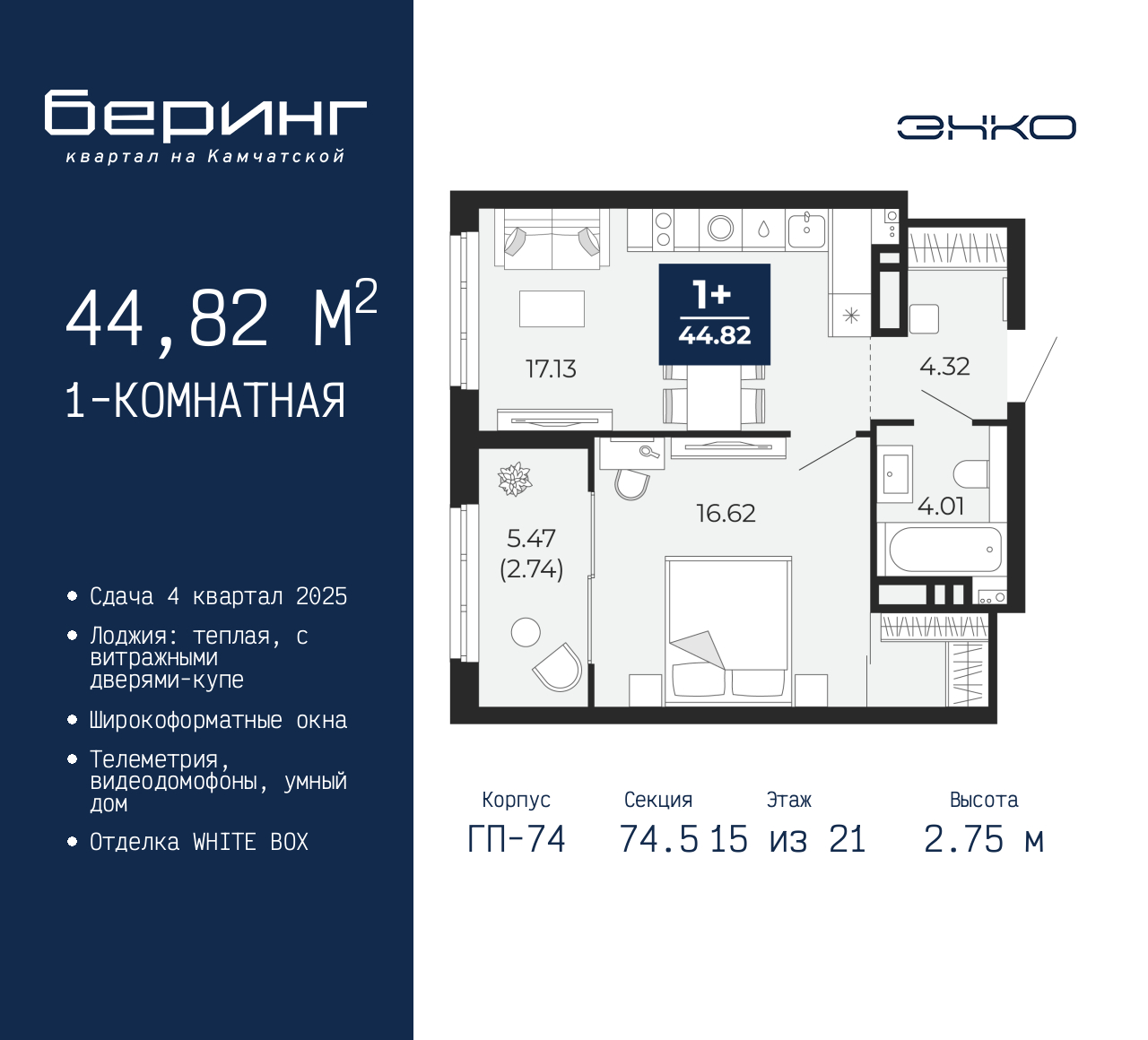 1-комн. квартира в ЖК "Беринг" на 15 этаже. Квартира без отделки, после выдачи ключей можно делать ремонт. Общая площадь: 44.82 кв.м., жилая: 16.62 кв.м., площадь просторной кухни-столовой: 17.13 кв.м. Все окна выходят на одну сторону. В квартире одна лоджия, один совмещенный санузел. Высота потолков 2.75 м. Дом монолитный, многоподъездный, переменной этажности, от 9 до 21 этажей. Квартира находится в 74.5-й секции высотой 21 этаж в корпусе ГП-74. На этаже 7 квартир. В подъезде 1 пассажирский и 1 грузовой лифт. Окончание строительства - 4 квартал 2025 года. Оформление сделки по договору долевого участия. Подобно знаменитому исследователю, мы чувствуем себя первооткрывателями этой локации. Хотим показать новую суть места, сформировать для вас жизненный опыт, которого ещё не было. Беринг — район зелёного цвета. Беринг — район, который откроется вам с другой стороны. Впечатлит новым уровнем комфорта и качеством жизни. Беринг — открытие на карте города. Первый квартал расположен в районе Тура, в границах улиц: Камчатская – Западносибирская – Энтузиастов. Вокруг уже есть всё для того, чтобы ежедневная рутина была лишь частью жизни и не доставляла дискомфорта. Школы и детские сады, магазины и аптеки, поликлиника, места для семейного отдыха, пеших и велопрогулок, и даже рыбалки. Масштабное озеленение дворов — визитная карточка ЭНКО и ваш оазис спокойствия, чтобы отвлечься от повседневности. Раскидистые деревья, кустарники, травы и цветы — осталось остановиться, вдохнуть и расслабиться, глядя на эту природную красоту. Стилистика подъездов продолжает концепцию Беринга, вдохновлённого Камчаткой: сдержанный, но при этом впечатляющий дизайн соседствует с удобством и функциональностью. (AQID02501721)