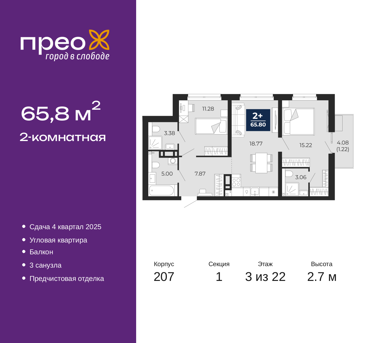 2-комн. квартира с предчистовой отделкой в ЖК "Прео" на 3 этаже. Общая площадь: 65.8 кв.м., жилая: 26.5 кв.м., площадь просторной кухни-столовой: 18.77 кв.м. Угловая квартира, идеально подойдет любителям тишины и панорамных видов. В квартире один балкон, три совмещенных санузла. Высота потолков 2.7 м. Дом монолитный, двухподъездный, высотой 22 этажа. Квартира находится в 1-й секции в корпусе 207. На этаже 8 квартир. В подъезде 1 пассажирский и 1 грузовой лифт. Окончание строительства - 4 квартал 2025 года. Оформление сделки по договору долевого участия. Преображенский — один из самых привлекательных районов для жизни! Это полностью самостоятельный жилой район с точки зрения инфраструктуры. Преображенский находится между Московским и Червишевским трактами в квартале улиц Закалужская — Вьюжная — Александра Протозанова. Не нужно ждать, когда появится инфраструктура — переезжайте на всё готовое. Вблизи расположены действующие школа и детский сад. В этом году откроется еще один сад, а в следующем году — школа. По соседству с Преображенским запланировано строительство городского парка «Комарово» площадью 38 гектар. За 10 минут можно доехать на автомобиле до крупных ТРЦ: «Лента», «Кристалл», «Леруа Мерлен», «Метро» и «Ашан». С 2018 года в районе открыт Соседский центр — пространство, созданное для формирования добрососедской среды, совместного досуга, общения и реализации соседских инициатив. Здесь проходят встречи соседей, а также сами жители района организовывают мероприятия. Организатором такого события может стать любой желающий. В квартирах выполнена качественная предчистовая отделка. Гладкие стены с финишным выравниванием по маякам. Ровный потолок для установки натяжного потолка. Установлены пятикамерные окна с двойным стеклопакетом (3 стекла). Дизайнерские холлы с видеонаблюдением, безбарьерным и прозрачным входом – всегда светло и спокойно. На первом этаже есть просторные колясочные, где все жители могут оставлять свои коляски и велосипеды. В Преображенском есть всё, что нужно для активного отдыха и занятий спортом. Мы сделали большое футбольное поле с безопасным покрытием. Также установили хоккейный корт, который оборудован по всем необходимым стандартам. Во дворах можно делать упражнения на специальных площадках с турниками. Весь район мы обустроили велодорожками, которые связаны в единый маршрут. У нас есть сухие фонтаны, бьющие из земли, деревья, веревки, сетки, скалодром, газон, песок и резинка — осталось просто дать своему ребенку право на свободную игру. По-настоящему хорошие дворы — это те, которые дети предпочитают соцсетям и телевизору. Аккредитация в банках: ПАО Банк «ВТБ», «Сбербанк России», ПАО «Банк Уралсиб», ПАО «Газпромбанк», ОАО «Альфа-Банк» и других. (AQID02502744)