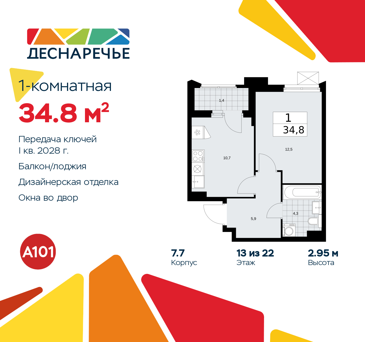 Продается 1-комн. квартира с отделкой в ЖК "Деснаречье" на 13 этаже. Общая площадь: 34.8 кв.м., жилая: 12.5 кв.м., площадь просторной кухни-столовой: 10.7 кв.м. Все окна выходят на одну сторону. В квартире одна лоджия, один совмещенный санузел. Высота потолков 2.95 м. Эта квартира будет сдана с дизайнеркой отделкой "под ключ". Специально для вас мы разработали несколько решений дизайнерской отделки. В отделке используются только современный высококлассные материалы, на все работы предоставляется гарантия. В таком случае вы оплачиваете отделку в сегодняшних ценах, а эту стоимость вы можете разнести в ипотечных платежах. Квартира находится в корпусе 7.7. Дом монолитный, одноподъездный, высотой 22 этажа. На этаже 9 квартир. В подъезде 1 пассажирский и 2 грузовых лифта. Начало строительства - 2 квартал 2025 года. Окончание строительства - 1 квартал 2028 года. Оформление сделки по договору долевого участия. Артикул квартиры по базе застройщика 88К-7.7-1417. ПРЕДЛОЖЕНИЯ ОТ ЗАСТРОЙЩИКА В ОКТЯБРЕ 2025: Ипотека от 13,9 % для всех! На весь срок. "Семейная ипотека" вернулась. Ставка от 3,5 % на весь срок! Без удорожания! Выгодное ипотечное комбо: Ипотека от 2200 р./мес. и от 6 % после рождения ребёнка! Ипотека для всех "Держи пять!" - ставка 5 % на 2 года! *более подробную информацию по скидкам и акциям уточняйте в отделе продаж Масштабный проект "Деснаречье" на юго-западе Москвы, который включает три новых района («квартала»), объединённые общей идеей – воплотить в реальность мечты современных жителей столицы об интересном, комфортном и разноплановом городском пространстве в окружении рек и лесов, словно сошедших с полотен русских живописцев: - «Берег» оценят все, кому близка водная стихия: плеск волн, солнечные блики и прогулки вдоль тихого течения речи. - «Лес» утопает в зелени парков и лесов. Здесь соблюдён идеальный баланс загородного спокойствия и столичного комфорта. - «Парк», самый энергичный и яркий, отличается высокой концентрацией пространств для спорта и творчества. Жилой комплекс "Деснаречье" расположится в 12 км от МКАД по современному Калужскому шоссе. Внешний облик зданий соответствует современному стилю и стандартам, характерным и для других популярных проектов ГК «А101»: сочетание контрастных тонов, большое количество остекления, в котором отражается небо, гармония с природным окружением. Весь город - в вашем районе. Находиться на территории «15-минутного города» значит иметь всё необходимое для полноценной жизни в шаговой доступности. Маршруты в районе «Деснаречье» выстроены так, чтобы добраться до магазинов, парков, школ, салонов услуг и других объектов можно было всего за несколько минут пешком или на велосипеде. Двор закрытый от машин – это тишина, комфорт и безопасность, поэтому все машино-места (включая «семейные» и увеличенные, с возможностью установки роллетных шкафов) находятся в подземном паркинге. В паркинги можно спуститься на лифте из любого подъезда или по лестнице. Рядом с «Деснаречьем» в 2027 году планируется открытие станции метро «Десна», до которой будет удобно добраться пешком или на велосипеде. Дорога на автомобиле до перехватывающих парковок станций «Ольховая» и «Прокшино» займёт около 10 минут. В процессе реализации проекта будут появляться новые маршруты общественного транспорта по районам. Уже сейчас на Калужском шоссе развита сеть наземного