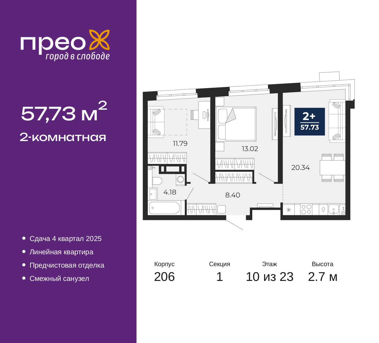 2-комн. квартира с предчистовой отделкой в ЖК "Прео" на 10 этаже. Общая площадь: 57.73 кв.м., жилая: 24.81 кв.м., площадь просторной кухни-столовой: 20.34 кв.м. Комнаты изолированные, все окна выходят на одну сторону. В квартире один совмещенный санузел. Высота потолков 2.7 м. Дом монолитный, трехподъездный, переменной этажности, от 14 до 23 этажей. Квартира находится в 1-й секции высотой 23 этажа в корпусе 206. На этаже 8 квартир. В подъезде 1 пассажирский и 1 грузовой лифт. Окончание строительства - 4 квартал 2025 года. Оформление сделки по договору долевого участия. Преображенский — один из самых привлекательных районов для жизни! Это полностью самостоятельный жилой район с точки зрения инфраструктуры. Преображенский находится между Московским и Червишевским трактами в квартале улиц Закалужская — Вьюжная — Александра Протозанова. Не нужно ждать, когда появится инфраструктура — переезжайте на всё готовое. Вблизи расположены действующие школа и детский сад. В этом году откроется еще один сад, а в следующем году — школа. По соседству с Преображенским запланировано строительство городского парка «Комарово» площадью 38 гектар. За 10 минут можно доехать на автомобиле до крупных ТРЦ: «Лента», «Кристалл», «Леруа Мерлен», «Метро» и «Ашан». С 2018 года в районе открыт Соседский центр — пространство, созданное для формирования добрососедской среды, совместного досуга, общения и реализации соседских инициатив. Здесь проходят встречи соседей, а также сами жители района организовывают мероприятия. Организатором такого события может стать любой желающий. В квартирах выполнена качественная предчистовая отделка. Гладкие стены с финишным выравниванием по маякам. Ровный потолок для установки натяжного потолка. Установлены пятикамерные окна с двойным стеклопакетом (3 стекла). Дизайнерские холлы с видеонаблюдением, безбарьерным и прозрачным входом – всегда светло и спокойно. На первом этаже есть просторные колясочные, где все жители могут оставлять свои коляски и велосипеды. В Преображенском есть всё, что нужно для активного отдыха и занятий спортом. Мы сделали большое футбольное поле с безопасным покрытием. Также установили хоккейный корт, который оборудован по всем необходимым стандартам. Во дворах можно делать упражнения на специальных площадках с турниками. Весь район мы обустроили велодорожками, которые связаны в единый маршрут. У нас есть сухие фонтаны, бьющие из земли, деревья, веревки, сетки, скалодром, газон, песок и резинка — осталось просто дать своему ребенку право на свободную игру. По-настоящему хорошие дворы — это те, которые дети предпочитают соцсетям и телевизору. Аккредитация в банках: ОАО «Альфа-Банк», ПАО Банк «ВТБ», ПАО «Банк Уралсиб», ПАО «Газпромбанк», «Сбербанк России» и других. (AQID02468433)