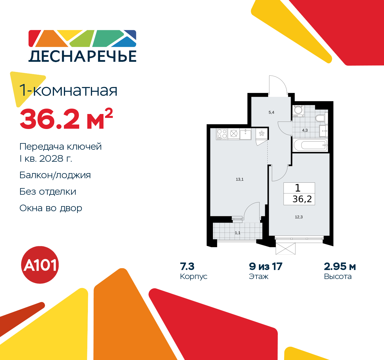 Однокомнатная квартира в ЖК "Деснаречье" на 9 этаже. Квартира без отделки, новый владелец может сделать ремонт по индивидуальному проекту. Общая площадь: 36.2 кв.м., жилая: 12.3 кв.м., площадь просторной кухни-столовой: 13.1 кв.м. Все окна выходят на одну сторону. В квартире одна лоджия, один совмещенный санузел. Высота потолков 2.95 м. Эта квартира предлагается без отделки. Будут установлены стеклопакеты с повышенной тепло- и шумоизоляцией, в квартиру заведены все коммуникации. Вы сможете в полном объеме реализовать ваши идеи обустройства вашего комфортного дома. Для тех, кто ценит время и не хочет дополнительных трат на ремонт мы предлагаем квартиры с предчистовой и дизайнерской отделкой. Дом монолитный, черырехподъездный, переменной этажности, от 9 до 17 этажей. Квартира находится в 1-й секции высотой 15 этажей в корпусе 7.3. На этаже 5 квартир. В подъезде 1 пассажирский и 1 грузовой лифт. Начало строительства - 2 квартал 2025 года. Окончание строительства - 1 квартал 2028 года. Оформление сделки по договору долевого участия. Артикул квартиры по базе застройщика 88К-7.3-626. ПРЕДЛОЖЕНИЯ ОТ ЗАСТРОЙЩИКА В ОКТЯБРЕ 2025: Ипотека от 13,9 % для всех! На весь срок. "Семейная ипотека" вернулась. Ставка от 3,5 % на весь срок! Без удорожания! Выгодное ипотечное комбо: Ипотека от 2200 р./мес. и от 6 % после рождения ребёнка! Ипотека для всех "Держи пять!" - ставка 5 % на 2 года! *более подробную информацию по скидкам и акциям уточняйте в отделе продаж Масштабный проект "Деснаречье" на юго-западе Москвы, который включает три новых района («квартала»), объединённые общей идеей – воплотить в реальность мечты современных жителей столицы об интересном, комфортном и разноплановом городском пространстве в окружении рек и лесов, словно сошедших с полотен русских живописцев: - «Берег» оценят все, кому близка водная стихия: плеск волн, солнечные блики и прогулки вдоль тихого течения речи. - «Лес» утопает в зелени парков и лесов. Здесь соблюдён идеальный баланс загородного спокойствия и столичного комфорта. - «Парк», самый энергичный и яркий, отличается высокой концентрацией пространств для спорта и творчества. Жилой комплекс "Деснаречье" расположится в 12 км от МКАД по современному Калужскому шоссе. Внешний облик зданий соответствует современному стилю и стандартам, характерным и для других популярных проектов ГК «А101»: сочетание контрастных тонов, большое количество остекления, в котором отражается небо, гармония с природным окружением. Весь город - в вашем районе. Находиться на территории «15-минутного города» значит иметь всё необходимое для полноценной жизни в шаговой доступности. Маршруты в районе «Деснаречье» выстроены так, чтобы добраться до магазинов, парков, школ, салонов услуг и других объектов можно было всего за несколько минут пешком или на велосипеде. Двор закрытый от машин – это тишина, комфорт и безопасность, поэтому все машино-места (включая «семейные» и увеличенные, с возможностью установки роллетных шкафов) находятся в подземном паркинге. В паркинги можно спуститься на лифте из любого подъезда или по лестнице. Рядом с «Деснаречьем» в 2027 году планируется открытие станции метро «Десна», до которой будет удобно добраться пешком или на велосипеде. Дорога на автомобиле до перехватывающих парковок станций «Ольховая» и «Прокшино» займёт около 10 минут. В процессе реализации про