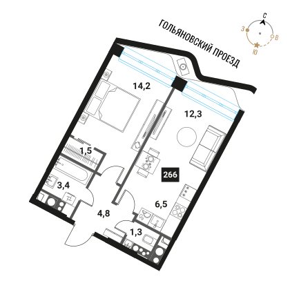- Общая площадь 44 м²