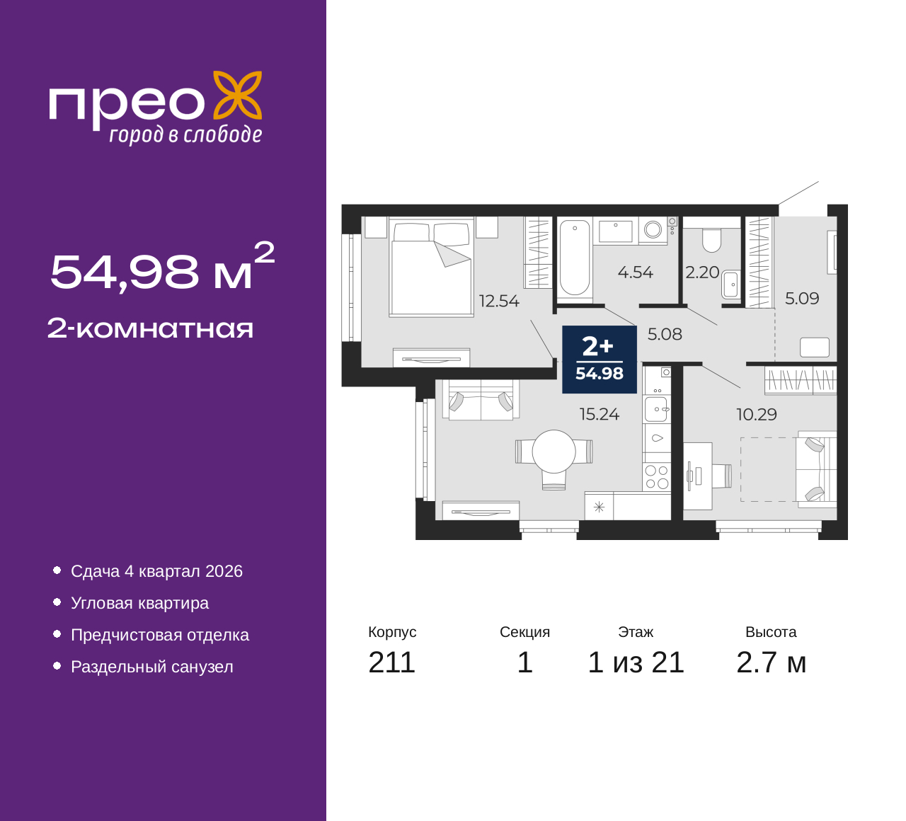 2-комн. квартира от застройщика с предчистовой отделкой в ЖК "Прео" на 1 этаже. Общая площадь: 54.98 кв.м., жилая: 22.83 кв.м., площадь просторной кухни-столовой: 15.24 кв.м. Угловая квартира, окна oбecпeчивaют paвнoмepнoe ocвeщeниe в тeчeниe дня. В квартире один раздельный санузел. Высота потолков 2.7 м. Дом монолитный, черырехподъездный, переменной этажности, от 14 до 21 этажей. Квартира находится в 1-й секции высотой 21 этаж в корпусе 211. На этаже 8 квартир. В подъезде 1 пассажирский и 1 грузовой лифт. Окончание строительства - 4 квартал 2026 года. Оформление сделки по договору долевого участия. Преображенский — один из самых привлекательных районов для жизни! Это полностью самостоятельный жилой район с точки зрения инфраструктуры. Преображенский находится между Московским и Червишевским трактами в квартале улиц Закалужская — Вьюжная — Александра Протозанова. Не нужно ждать, когда появится инфраструктура — переезжайте на всё готовое. Вблизи расположены действующие школа и детский сад. В этом году откроется еще один сад, а в следующем году — школа. По соседству с Преображенским запланировано строительство городского парка «Комарово» площадью 38 гектар. За 10 минут можно доехать на автомобиле до крупных ТРЦ: «Лента», «Кристалл», «Леруа Мерлен», «Метро» и «Ашан». С 2018 года в районе открыт Соседский центр — пространство, созданное для формирования добрососедской среды, совместного досуга, общения и реализации соседских инициатив. Здесь проходят встречи соседей, а также сами жители района организовывают мероприятия. Организатором такого события может стать любой желающий. В квартирах выполнена качественная предчистовая отделка. Гладкие стены с финишным выравниванием по маякам. Ровный потолок для установки натяжного потолка. Установлены пятикамерные окна с двойным стеклопакетом (3 стекла). Дизайнерские холлы с видеонаблюдением, безбарьерным и прозрачным входом – всегда светло и спокойно. На первом этаже есть просторные колясочные, где все жители могут оставлять свои коляски и велосипеды. В Преображенском есть всё, что нужно для активного отдыха и занятий спортом. Мы сделали большое футбольное поле с безопасным покрытием. Также установили хоккейный корт, который оборудован по всем необходимым стандартам. Во дворах можно делать упражнения на специальных площадках с турниками. Весь район мы обустроили велодорожками, которые связаны в единый маршрут. У нас есть сухие фонтаны, бьющие из земли, деревья, веревки, сетки, скалодром, газон, песок и резинка — осталось просто дать своему ребенку право на свободную игру. По-настоящему хорошие дворы — это те, которые дети предпочитают соцсетям и телевизору. Аккредитация в банках: «Сбербанк России», ПАО Банк «ВТБ», ПАО «Газпромбанк», ПАО «Банк Уралсиб», ОАО «Альфа-Банк» и других. (AQID02470431)