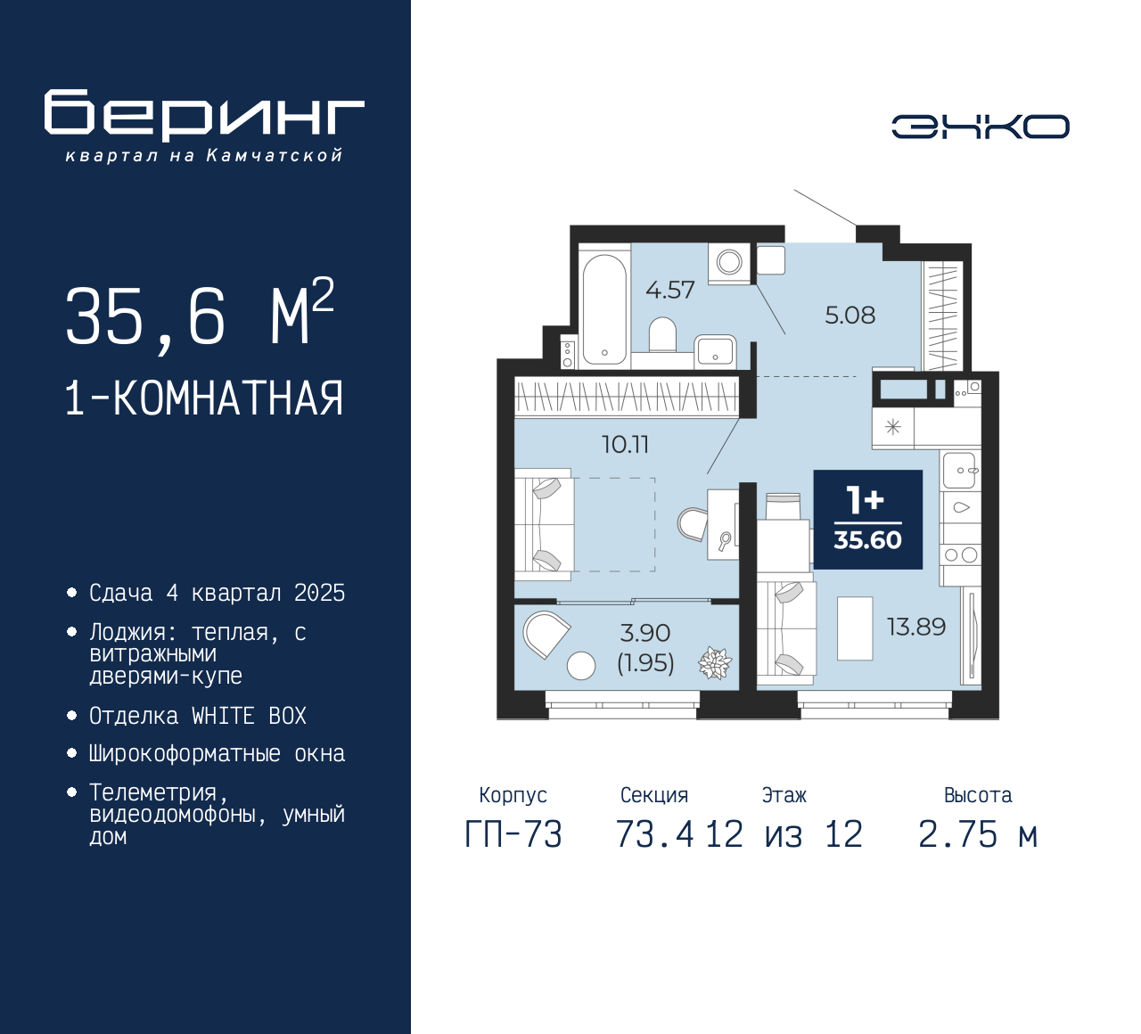 Продается 1-комн. квартира в ЖК "Беринг" на 12 этаже. Квартира без отделки, после выдачи ключей можно делать ремонт. Общая площадь: 35.6 кв.м., жилая: 10.11 кв.м., площадь просторной кухни-столовой: 13.89 кв.м. Все окна выходят на одну сторону. В квартире одна лоджия, один совмещенный санузел. Высота потолков 2.75 м. Дом монолитный, многоподъездный, переменной этажности, от 9 до 22 этажей. Квартира находится в 73.4-й секции высотой 12 этажей в корпусе ГП-73. На этаже 8 квартир. В подъезде 1 пассажирский и 1 грузовой лифт. Окончание строительства - 4 квартал 2025 года. Оформление сделки по договору долевого участия. Подобно знаменитому исследователю, мы чувствуем себя первооткрывателями этой локации. Хотим показать новую суть места, сформировать для вас жизненный опыт, которого ещё не было. Беринг — район зелёного цвета. Беринг — район, который откроется вам с другой стороны. Впечатлит новым уровнем комфорта и качеством жизни. Беринг — открытие на карте города. Первый квартал расположен в районе Тура, в границах улиц: Камчатская – Западносибирская – Энтузиастов. Вокруг уже есть всё для того, чтобы ежедневная рутина была лишь частью жизни и не доставляла дискомфорта. Школы и детские сады, магазины и аптеки, поликлиника, места для семейного отдыха, пеших и велопрогулок, и даже рыбалки. Масштабное озеленение дворов — визитная карточка ЭНКО и ваш оазис спокойствия, чтобы отвлечься от повседневности. Раскидистые деревья, кустарники, травы и цветы — осталось остановиться, вдохнуть и расслабиться, глядя на эту природную красоту. Стилистика подъездов продолжает концепцию Беринга, вдохновлённого Камчаткой: сдержанный, но при этом впечатляющий дизайн соседствует с удобством и функциональностью. (AQID02497857)