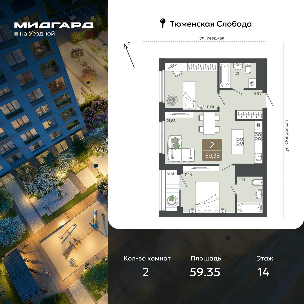 Просторная двухкомнатная квартира в ЖК "Мидгард на Уездной" на 14 этаже. Квартира без отделки, новый собственник может сделать ремонт по своему проекту. Общая площадь: 59.35 кв.м., жилая: 22.15 кв.м., площадь просторной кухни-столовой: 21.68 кв.м. Комнаты изолированные, все окна выходят на одну сторону. В квартире одна лоджия, два совмещенных санузла. Высота потолков 2.72 м. Дом монолитный, черырехподъездный, переменной этажности, от 9 до 15 этажей. Квартира находится в 3-й секции высотой 15 этажей в корпусе ГП-1. На этаже 8 квартир. В подъезде 1 пассажирский и 1 грузовой лифт. Окончание строительства - 3 квартал 2027 года. Оформление сделки по договору долевого участия. «Мидгард на Уездной» - современный проект комфорт-класса, расположенный на первой линии Тюменской слободы, с видом на развязку Московского тракта. Он сочетает в себе современные архитектурные решения и комфортное проживание в гармонии с природой. Жилой комплекс находится в перспективном районе, который отличается транспортной доступностью: до крупных торговых центров «Кристалл» и «Колумб» можно добраться за 10 минут, а до центра города - за 15 минут. В шаговой доступности школы, детские сады, торговые центры и парки, что делает локацию идеальной для комфортной жизни. Проектом предусмотрены дома с дизайнерскими входными зонами и планировочными решения для любого сценария жизни с возможностью включить в ипотечный платеж ремонт, мебель и технику от застройщика. Закрытый двор и собственная аллея вдоль жилого комплекса позволят насладиться тишиной вдали от суеты большого города. (AQID02514160)