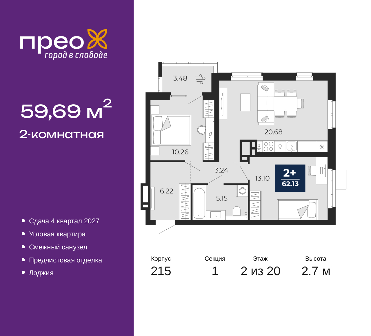 Двухкомнатная квартира с предчистовой отделкой в ЖК "Прео" на 2 этаже. Общая площадь: 59.69 кв.м., жилая: 23.36 кв.м., площадь просторной кухни-столовой: 20.68 кв.м. Угловая квартира, очень светлая, естественная вентиляция при открытии окон. В квартире одна лоджия, один совмещенный санузел. Высота потолков 2.7 м. Квартира находится в корпусе 215. Дом монолитный, одноподъездный, высотой 20 этажей. На этаже 8 квартир. В подъезде 1 пассажирский и 1 грузовой лифт. Окончание строительства - 4 квартал 2027 года. Оформление сделки по договору долевого участия. Преображенский — один из самых привлекательных районов для жизни! Это полностью самостоятельный жилой район с точки зрения инфраструктуры. Преображенский находится между Московским и Червишевским трактами в квартале улиц Закалужская — Вьюжная — Александра Протозанова. Не нужно ждать, когда появится инфраструктура — переезжайте на всё готовое. Вблизи расположены действующие школа и детский сад. В этом году откроется еще один сад, а в следующем году — школа. По соседству с Преображенским запланировано строительство городского парка «Комарово» площадью 38 гектар. За 10 минут можно доехать на автомобиле до крупных ТРЦ: «Лента», «Кристалл», «Леруа Мерлен», «Метро» и «Ашан». С 2018 года в районе открыт Соседский центр — пространство, созданное для формирования добрососедской среды, совместного досуга, общения и реализации соседских инициатив. Здесь проходят встречи соседей, а также сами жители района организовывают мероприятия. Организатором такого события может стать любой желающий. В квартирах выполнена качественная предчистовая отделка. Гладкие стены с финишным выравниванием по маякам. Ровный потолок для установки натяжного потолка. Установлены пятикамерные окна с двойным стеклопакетом (3 стекла). Дизайнерские холлы с видеонаблюдением, безбарьерным и прозрачным входом – всегда светло и спокойно. На первом этаже есть просторные колясочные, где все жители могут оставлять свои коляски и велосипеды. В Преображенском есть всё, что нужно для активного отдыха и занятий спортом. Мы сделали большое футбольное поле с безопасным покрытием. Также установили хоккейный корт, который оборудован по всем необходимым стандартам. Во дворах можно делать упражнения на специальных площадках с турниками. Весь район мы обустроили велодорожками, которые связаны в единый маршрут. У нас есть сухие фонтаны, бьющие из земли, деревья, веревки, сетки, скалодром, газон, песок и резинка — осталось просто дать своему ребенку право на свободную игру. По-настоящему хорошие дворы — это те, которые дети предпочитают соцсетям и телевизору. Аккредитация в банках: ПАО Банк «ВТБ», ПАО «Газпромбанк», ОАО «Альфа-Банк», ПАО «Банк Уралсиб», «Сбербанк России» и других. (AQID02525528)