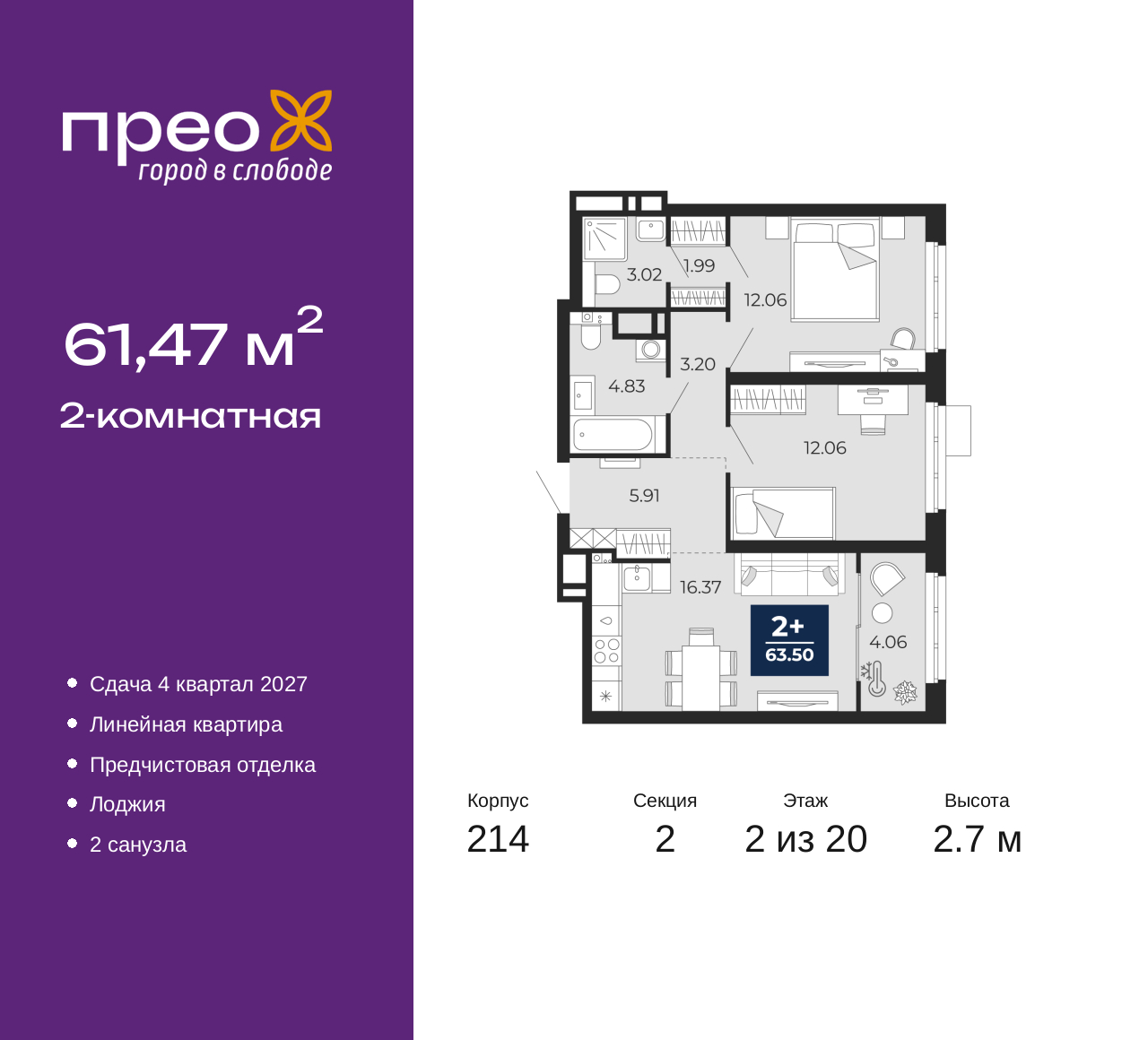 2-комн. квартира с предчистовой отделкой в ЖК "Прео" на 2 этаже. Общая площадь: 61.47 кв.м., жилая: 24.12 кв.м., площадь просторной кухни-столовой: 16.37 кв.м. Комнаты изолированные, все окна выходят на одну сторону. В квартире одна лоджия, два совмещенных санузла. Высота потолков 2.7 м. Дом монолитный, двухподъездный, переменной этажности, от 12 до 20 этажей. Квартира находится во 2-й секции высотой 20 этажей в корпусе 214. На этаже 8 квартир. В подъезде 1 пассажирский и 1 грузовой лифт. Окончание строительства - 4 квартал 2027 года. Оформление сделки по договору долевого участия. Преображенский — один из самых привлекательных районов для жизни! Это полностью самостоятельный жилой район с точки зрения инфраструктуры. Преображенский находится между Московским и Червишевским трактами в квартале улиц Закалужская — Вьюжная — Александра Протозанова. Не нужно ждать, когда появится инфраструктура — переезжайте на всё готовое. Вблизи расположены действующие школа и детский сад. В этом году откроется еще один сад, а в следующем году — школа. По соседству с Преображенским запланировано строительство городского парка «Комарово» площадью 38 гектар. За 10 минут можно доехать на автомобиле до крупных ТРЦ: «Лента», «Кристалл», «Леруа Мерлен», «Метро» и «Ашан». С 2018 года в районе открыт Соседский центр — пространство, созданное для формирования добрососедской среды, совместного досуга, общения и реализации соседских инициатив. Здесь проходят встречи соседей, а также сами жители района организовывают мероприятия. Организатором такого события может стать любой желающий. В квартирах выполнена качественная предчистовая отделка. Гладкие стены с финишным выравниванием по маякам. Ровный потолок для установки натяжного потолка. Установлены пятикамерные окна с двойным стеклопакетом (3 стекла). Дизайнерские холлы с видеонаблюдением, безбарьерным и прозрачным входом – всегда светло и спокойно. На первом этаже есть просторные колясочные, где все жители могут оставлять свои коляски и велосипеды. В Преображенском есть всё, что нужно для активного отдыха и занятий спортом. Мы сделали большое футбольное поле с безопасным покрытием. Также установили хоккейный корт, который оборудован по всем необходимым стандартам. Во дворах можно делать упражнения на специальных площадках с турниками. Весь район мы обустроили велодорожками, которые связаны в единый маршрут. У нас есть сухие фонтаны, бьющие из земли, деревья, веревки, сетки, скалодром, газон, песок и резинка — осталось просто дать своему ребенку право на свободную игру. По-настоящему хорошие дворы — это те, которые дети предпочитают соцсетям и телевизору. Аккредитация в банках: ПАО Банк «ВТБ», «Сбербанк России», ПАО «Газпромбанк», ОАО «Альфа-Банк», ПАО «Банк Уралсиб» и других. (AQID02525556)