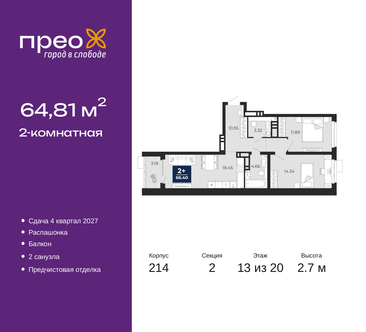 2-комн. квартира от застройщика с предчистовой отделкой в ЖК "Прео" на 13 этаже. Общая площадь: 64.81 кв.м., жилая: 26.23 кв.м., площадь просторной кухни-столовой: 18.45 кв.м. Квартира - распашонка, без проходных комнат, окна выходят на paзные стороны дома. В квартире один балкон, один совмещенный и один раздельный санузел. Высота потолков 2.7 м. Дом монолитный, двухподъездный, переменной этажности, от 12 до 20 этажей. Квартира находится во 2-й секции высотой 20 этажей в корпусе 214. На этаже 8 квартир. В подъезде 1 пассажирский и 1 грузовой лифт. Окончание строительства - 4 квартал 2027 года. Оформление сделки по договору долевого участия. Преображенский — один из самых привлекательных районов для жизни! Это полностью самостоятельный жилой район с точки зрения инфраструктуры. Преображенский находится между Московским и Червишевским трактами в квартале улиц Закалужская — Вьюжная — Александра Протозанова. Не нужно ждать, когда появится инфраструктура — переезжайте на всё готовое. Вблизи расположены действующие школа и детский сад. В этом году откроется еще один сад, а в следующем году — школа. По соседству с Преображенским запланировано строительство городского парка «Комарово» площадью 38 гектар. За 10 минут можно доехать на автомобиле до крупных ТРЦ: «Лента», «Кристалл», «Леруа Мерлен», «Метро» и «Ашан». С 2018 года в районе открыт Соседский центр — пространство, созданное для формирования добрососедской среды, совместного досуга, общения и реализации соседских инициатив. Здесь проходят встречи соседей, а также сами жители района организовывают мероприятия. Организатором такого события может стать любой желающий. В квартирах выполнена качественная предчистовая отделка. Гладкие стены с финишным выравниванием по маякам. Ровный потолок для установки натяжного потолка. Установлены пятикамерные окна с двойным стеклопакетом (3 стекла). Дизайнерские холлы с видеонаблюдением, безбарьерным и прозрачным входом – всегда светло и спокойно. На первом этаже есть просторные колясочные, где все жители могут оставлять свои коляски и велосипеды. В Преображенском есть всё, что нужно для активного отдыха и занятий спортом. Мы сделали большое футбольное поле с безопасным покрытием. Также установили хоккейный корт, который оборудован по всем необходимым стандартам. Во дворах можно делать упражнения на специальных площадках с турниками. Весь район мы обустроили велодорожками, которые связаны в единый маршрут. У нас есть сухие фонтаны, бьющие из земли, деревья, веревки, сетки, скалодром, газон, песок и резинка — осталось просто дать своему ребенку право на свободную игру. По-настоящему хорошие дворы — это те, которые дети предпочитают соцсетям и телевизору. Аккредитация в банках: ПАО «Банк Уралсиб», ПАО «Газпромбанк», ПАО Банк «ВТБ», ОАО «Альфа-Банк», «Сбербанк России» и других. (AQID02525598)