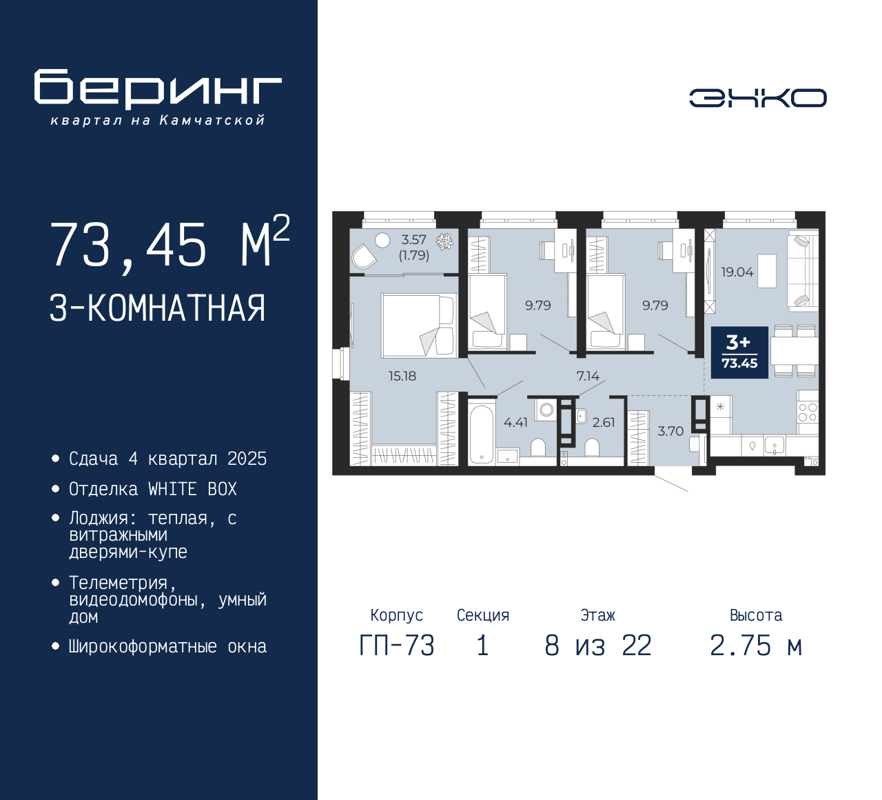 Трехкомнатная квартира в ЖК "Беринг" на 8 этаже. Квартира без отделки, новый владелец может сделать ремонт по индивидуальному дизайн-проекту. Общая площадь: 73.45 кв.м., жилая: 34.76 кв.м., площадь просторной кухни-столовой: 19.04 кв.м. Квартира угловая, идеально подойдет любителям тишины и панорамных видов. В квартире одна лоджия, один совмещенный и один раздельный санузел. Высота потолков 2.75 м. Дом монолитный, многоподъездный, переменной этажности, от 9 до 22 этажей. Квартира находится в 1-й секции высотой 22 этажа в корпусе ГП-73. На этаже 5 квартир. В подъезде 1 пассажирский и 1 грузовой лифт. Окончание строительства - 4 квартал 2025 года. Оформление сделки по договору долевого участия. Подобно знаменитому исследователю, мы чувствуем себя первооткрывателями этой локации. Хотим показать новую суть места, сформировать для вас жизненный опыт, которого ещё не было. Беринг — район зелёного цвета. Беринг — район, который откроется вам с другой стороны. Впечатлит новым уровнем комфорта и качеством жизни. Беринг — открытие на карте города. Первый квартал расположен в районе Тура, в границах улиц: Камчатская – Западносибирская – Энтузиастов. Вокруг уже есть всё для того, чтобы ежедневная рутина была лишь частью жизни и не доставляла дискомфорта. Школы и детские сады, магазины и аптеки, поликлиника, места для семейного отдыха, пеших и велопрогулок, и даже рыбалки. Масштабное озеленение дворов — визитная карточка ЭНКО и ваш оазис спокойствия, чтобы отвлечься от повседневности. Раскидистые деревья, кустарники, травы и цветы — осталось остановиться, вдохнуть и расслабиться, глядя на эту природную красоту. Стилистика подъездов продолжает концепцию Беринга, вдохновлённого Камчаткой: сдержанный, но при этом впечатляющий дизайн соседствует с удобством и функциональностью. (AQID02487883)