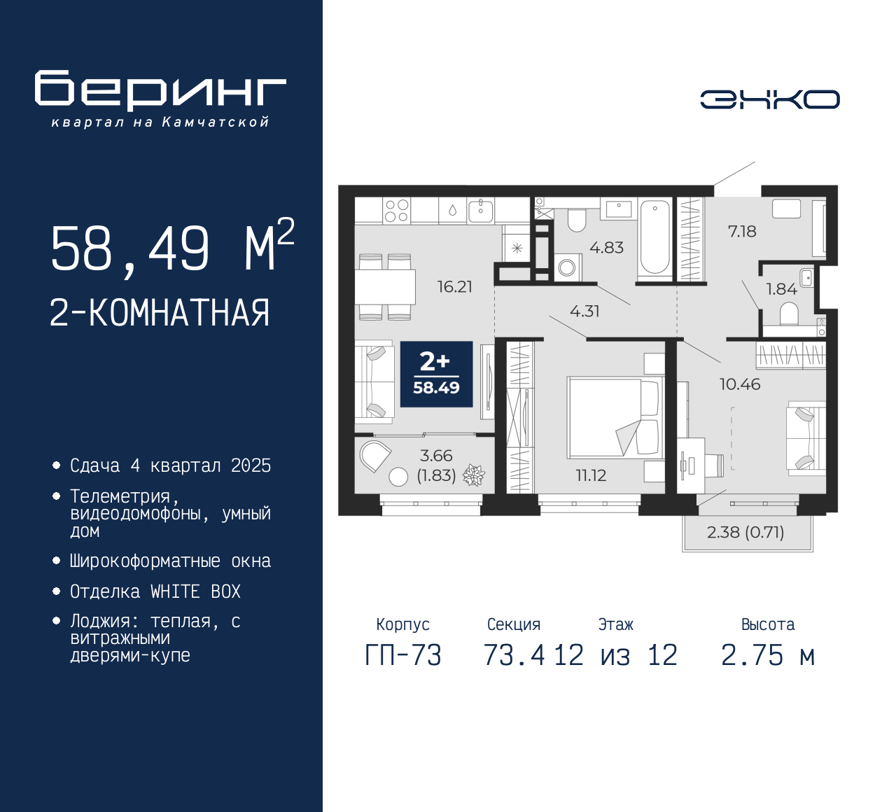 Просторная 2-комн. квартира в ЖК "Беринг" на 12 этаже. Квартира без отделки, после выдачи ключей можно делать ремонт. Общая площадь: 58.49 кв.м., жилая: 21.58 кв.м., площадь просторной кухни-столовой: 16.21 кв.м. Комнаты изолированные, все окна выходят на одну сторону. В квартире один балкон и одна лоджия, один совмещенный и один раздельный санузел. Высота потолков 2.75 м. Дом монолитный, многоподъездный, переменной этажности, от 9 до 22 этажей. Квартира находится в 73.4-й секции высотой 12 этажей в корпусе ГП-73. На этаже 8 квартир. В подъезде 1 пассажирский и 1 грузовой лифт. Окончание строительства - 4 квартал 2025 года. Оформление сделки по договору долевого участия. Подобно знаменитому исследователю, мы чувствуем себя первооткрывателями этой локации. Хотим показать новую суть места, сформировать для вас жизненный опыт, которого ещё не было. Беринг — район зелёного цвета. Беринг — район, который откроется вам с другой стороны. Впечатлит новым уровнем комфорта и качеством жизни. Беринг — открытие на карте города. Первый квартал расположен в районе Тура, в границах улиц: Камчатская – Западносибирская – Энтузиастов. Вокруг уже есть всё для того, чтобы ежедневная рутина была лишь частью жизни и не доставляла дискомфорта. Школы и детские сады, магазины и аптеки, поликлиника, места для семейного отдыха, пеших и велопрогулок, и даже рыбалки. Масштабное озеленение дворов — визитная карточка ЭНКО и ваш оазис спокойствия, чтобы отвлечься от повседневности. Раскидистые деревья, кустарники, травы и цветы — осталось остановиться, вдохнуть и расслабиться, глядя на эту природную красоту. Стилистика подъездов продолжает концепцию Беринга, вдохновлённого Камчаткой: сдержанный, но при этом впечатляющий дизайн соседствует с удобством и функциональностью. (AQID02497859)