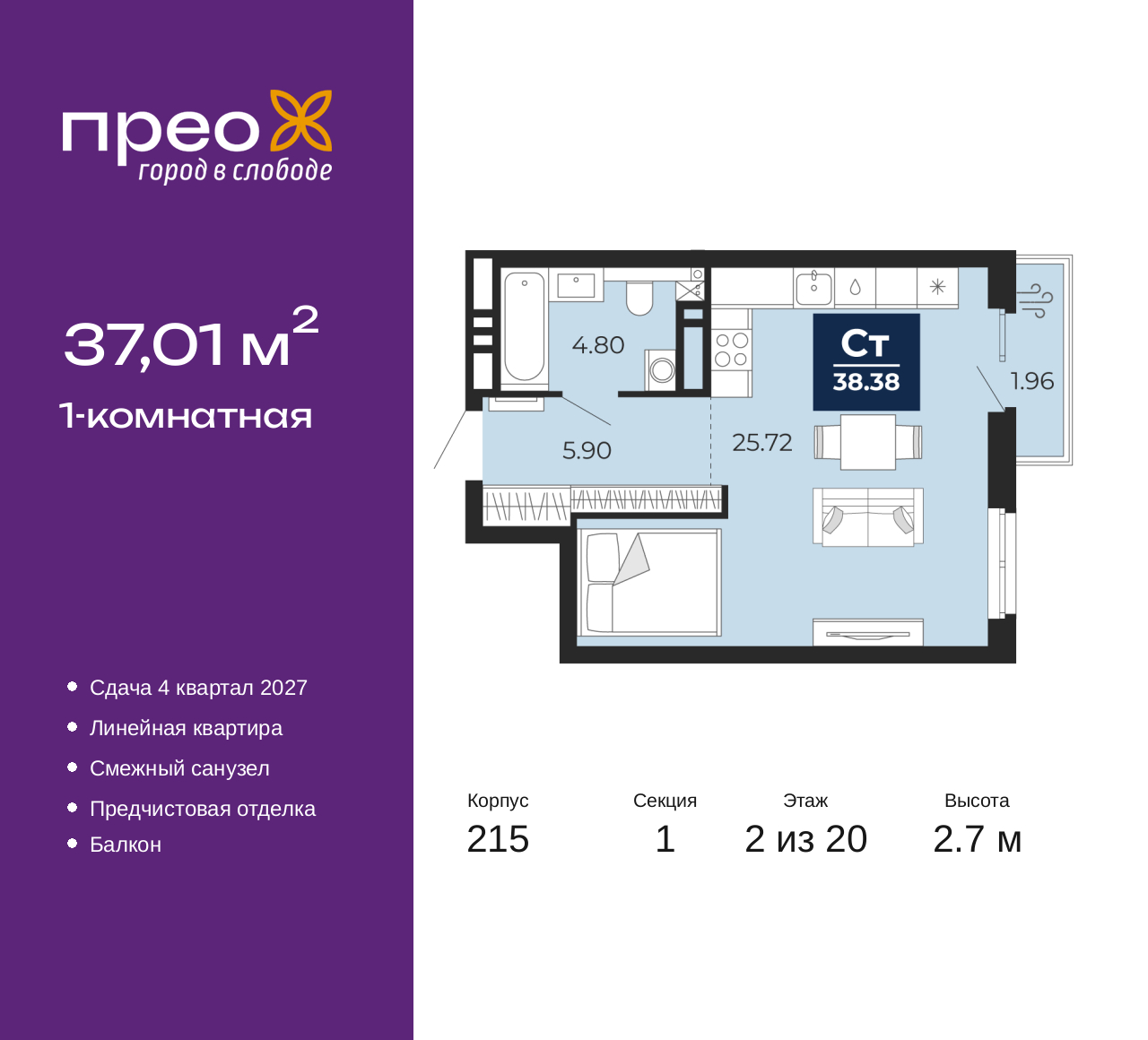 Просторная однокомнатная квартира с предчистовой отделкой в ЖК "Прео" на 2 этаже. Общая площадь: 37.01 кв.м., жилая: 20.72 кв.м., площадь кухни: 5 кв.м. Все окна выходят на одну сторону. В квартире один балкон, один совмещенный санузел. Высота потолков 2.7 м. Квартира находится в корпусе 215. Дом монолитный, одноподъездный, высотой 20 этажей. На этаже 8 квартир. В подъезде 1 пассажирский и 1 грузовой лифт. Окончание строительства - 4 квартал 2027 года. Оформление сделки по договору долевого участия. Преображенский — один из самых привлекательных районов для жизни! Это полностью самостоятельный жилой район с точки зрения инфраструктуры. Преображенский находится между Московским и Червишевским трактами в квартале улиц Закалужская — Вьюжная — Александра Протозанова. Не нужно ждать, когда появится инфраструктура — переезжайте на всё готовое. Вблизи расположены действующие школа и детский сад. В этом году откроется еще один сад, а в следующем году — школа. По соседству с Преображенским запланировано строительство городского парка «Комарово» площадью 38 гектар. За 10 минут можно доехать на автомобиле до крупных ТРЦ: «Лента», «Кристалл», «Леруа Мерлен», «Метро» и «Ашан». С 2018 года в районе открыт Соседский центр — пространство, созданное для формирования добрососедской среды, совместного досуга, общения и реализации соседских инициатив. Здесь проходят встречи соседей, а также сами жители района организовывают мероприятия. Организатором такого события может стать любой желающий. В квартирах выполнена качественная предчистовая отделка. Гладкие стены с финишным выравниванием по маякам. Ровный потолок для установки натяжного потолка. Установлены пятикамерные окна с двойным стеклопакетом (3 стекла). Дизайнерские холлы с видеонаблюдением, безбарьерным и прозрачным входом – всегда светло и спокойно. На первом этаже есть просторные колясочные, где все жители могут оставлять свои коляски и велосипеды. В Преображенском есть всё, что нужно для активного отдыха и занятий спортом. Мы сделали большое футбольное поле с безопасным покрытием. Также установили хоккейный корт, который оборудован по всем необходимым стандартам. Во дворах можно делать упражнения на специальных площадках с турниками. Весь район мы обустроили велодорожками, которые связаны в единый маршрут. У нас есть сухие фонтаны, бьющие из земли, деревья, веревки, сетки, скалодром, газон, песок и резинка — осталось просто дать своему ребенку право на свободную игру. По-настоящему хорошие дворы — это те, которые дети предпочитают соцсетям и телевизору. Аккредитация в банках: ПАО «Газпромбанк», ПАО «Банк Уралсиб», ПАО Банк «ВТБ», «Сбербанк России», ОАО «Альфа-Банк» и других. (AQID02525467)