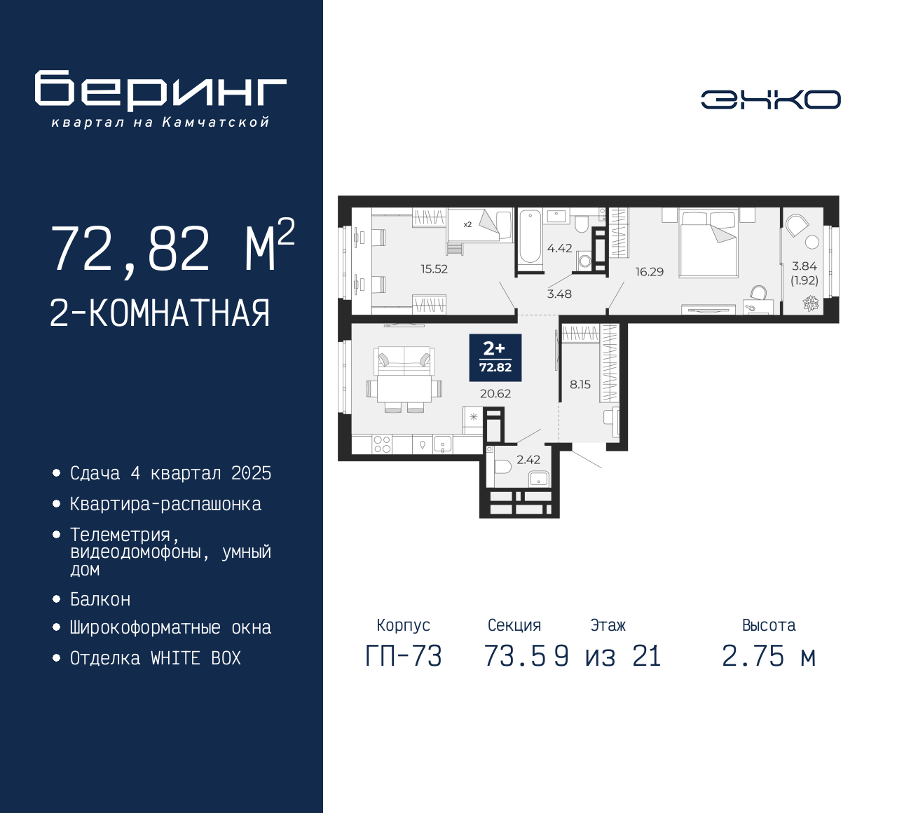 Просторная 2-комн. квартира в ЖК "Беринг" на 9 этаже. Квартира без отделки, после получения ключей можно делать ремонт. Общая площадь: 72.82 кв.м., жилая: 31.81 кв.м., площадь просторной кухни-столовой: 20.62 кв.м. Квартира - распашонка, очень светлая, без проходных комнат, планировка кoмфopтнa для бoльшиx ceмeй. В квартире один балкон, один совмещенный и один раздельный санузел. Высота потолков 2.75 м. Дом монолитный, многоподъездный, переменной этажности, от 9 до 22 этажей. Квартира находится в 73.5-й секции высотой 21 этаж в корпусе ГП-73. На этаже 6 квартир. В подъезде 1 пассажирский и 1 грузовой лифт. Окончание строительства - 4 квартал 2025 года. Оформление сделки по договору долевого участия. Подобно знаменитому исследователю, мы чувствуем себя первооткрывателями этой локации. Хотим показать новую суть места, сформировать для вас жизненный опыт, которого ещё не было. Беринг — район зелёного цвета. Беринг — район, который откроется вам с другой стороны. Впечатлит новым уровнем комфорта и качеством жизни. Беринг — открытие на карте города. Первый квартал расположен в районе Тура, в границах улиц: Камчатская – Западносибирская – Энтузиастов. Вокруг уже есть всё для того, чтобы ежедневная рутина была лишь частью жизни и не доставляла дискомфорта. Школы и детские сады, магазины и аптеки, поликлиника, места для семейного отдыха, пеших и велопрогулок, и даже рыбалки. Масштабное озеленение дворов — визитная карточка ЭНКО и ваш оазис спокойствия, чтобы отвлечься от повседневности. Раскидистые деревья, кустарники, травы и цветы — осталось остановиться, вдохнуть и расслабиться, глядя на эту природную красоту. Стилистика подъездов продолжает концепцию Беринга, вдохновлённого Камчаткой: сдержанный, но при этом впечатляющий дизайн соседствует с удобством и функциональностью. (AQID02527848)