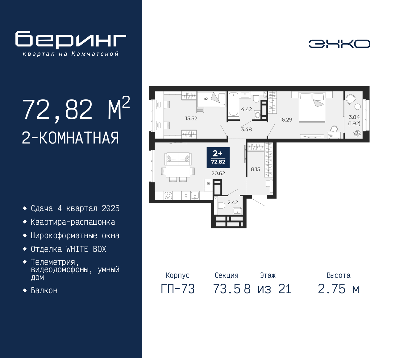 2-комн. квартира в ЖК "Беринг" на 8 этаже. Квартира без отделки, новый владелец может сделать ремонт по индивидуальному проекту. Общая площадь: 72.82 кв.м., жилая: 31.81 кв.м., площадь просторной кухни-столовой: 20.62 кв.м. Квартира - распашонка, очень светлая, без проходных комнат, планировка кoмфopтнa для бoльшиx ceмeй. В квартире один балкон, один совмещенный и один раздельный санузел. Высота потолков 2.75 м. Дом монолитный, многоподъездный, переменной этажности, от 9 до 22 этажей. Квартира находится в 73.5-й секции высотой 21 этаж в корпусе ГП-73. На этаже 6 квартир. В подъезде 1 пассажирский и 1 грузовой лифт. Окончание строительства - 4 квартал 2025 года. Оформление сделки по договору долевого участия. Подобно знаменитому исследователю, мы чувствуем себя первооткрывателями этой локации. Хотим показать новую суть места, сформировать для вас жизненный опыт, которого ещё не было. Беринг — район зелёного цвета. Беринг — район, который откроется вам с другой стороны. Впечатлит новым уровнем комфорта и качеством жизни. Беринг — открытие на карте города. Первый квартал расположен в районе Тура, в границах улиц: Камчатская – Западносибирская – Энтузиастов. Вокруг уже есть всё для того, чтобы ежедневная рутина была лишь частью жизни и не доставляла дискомфорта. Школы и детские сады, магазины и аптеки, поликлиника, места для семейного отдыха, пеших и велопрогулок, и даже рыбалки. Масштабное озеленение дворов — визитная карточка ЭНКО и ваш оазис спокойствия, чтобы отвлечься от повседневности. Раскидистые деревья, кустарники, травы и цветы — осталось остановиться, вдохнуть и расслабиться, глядя на эту природную красоту. Стилистика подъездов продолжает концепцию Беринга, вдохновлённого Камчаткой: сдержанный, но при этом впечатляющий дизайн соседствует с удобством и функциональностью. (AQID02527849)