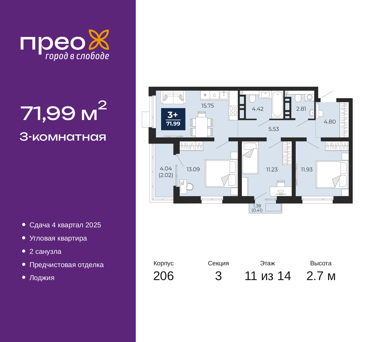 - Общая площадь 71.99 м²