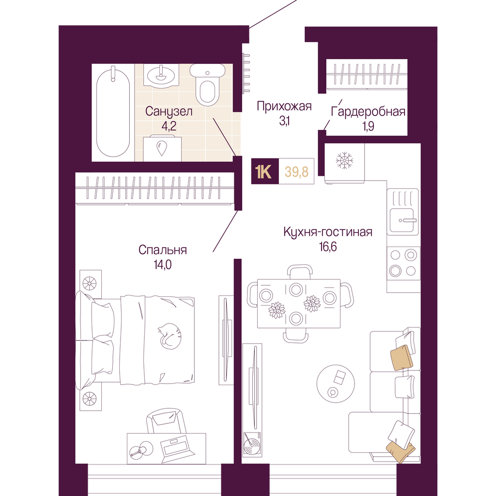 - Общая площадь 39.8 м²