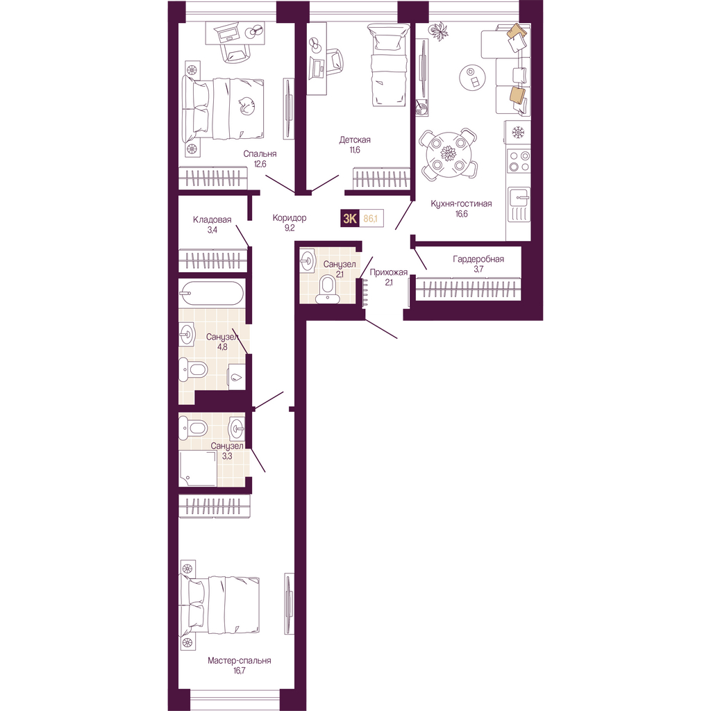 - Общая площадь 86.1 м²