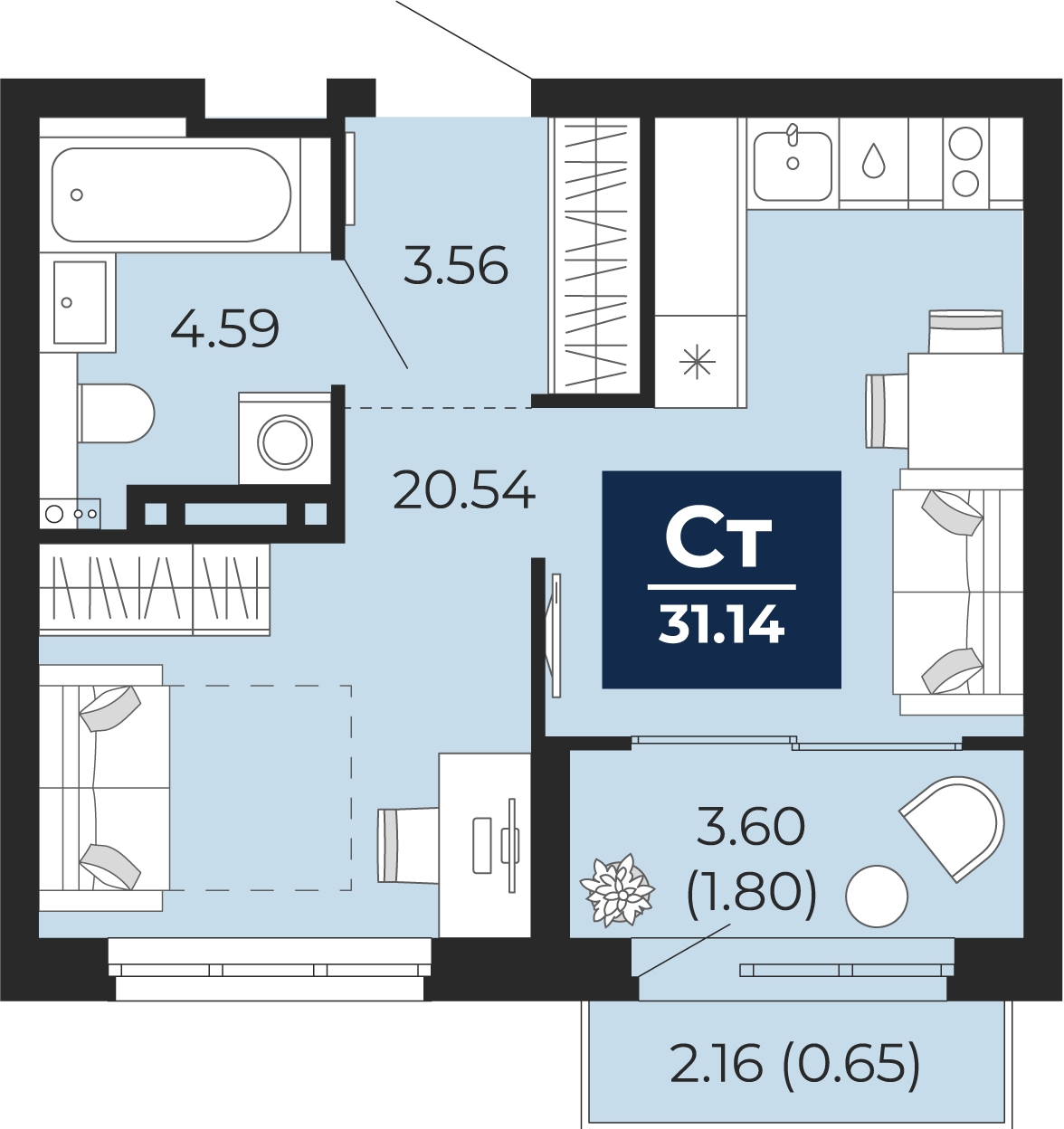 - Общая площадь 31.14 м²