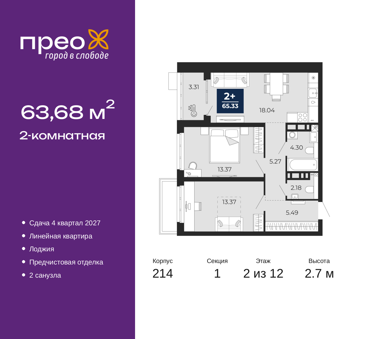 Продается двухкомнатная квартира от застройщика с предчистовой отделкой в ЖК "Прео" на 2 этаже. Общая площадь: 63.68 кв.м., жилая: 26.74 кв.м., площадь просторной кухни-столовой: 18.04 кв.м. Комнаты изолированные, все окна выходят на одну сторону. В квартире одна лоджия, один совмещенный и один раздельный санузел. Высота потолков 2.7 м. Дом монолитный, двухподъездный, переменной этажности, от 12 до 20 этажей. Квартира находится в 1-й секции высотой 12 этажей в корпусе 214. На этаже 8 квартир. В подъезде 1 пассажирский и 1 грузовой лифт. Окончание строительства - 4 квартал 2027 года. Оформление сделки по договору долевого участия. Преображенский — один из самых привлекательных районов для жизни! Это полностью самостоятельный жилой район с точки зрения инфраструктуры. Преображенский находится между Московским и Червишевским трактами в квартале улиц Закалужская — Вьюжная — Александра Протозанова. Не нужно ждать, когда появится инфраструктура — переезжайте на всё готовое. Вблизи расположены действующие школа и детский сад. В этом году откроется еще один сад, а в следующем году — школа. По соседству с Преображенским запланировано строительство городского парка «Комарово» площадью 38 гектар. За 10 минут можно доехать на автомобиле до крупных ТРЦ: «Лента», «Кристалл», «Леруа Мерлен», «Метро» и «Ашан». С 2018 года в районе открыт Соседский центр — пространство, созданное для формирования добрососедской среды, совместного досуга, общения и реализации соседских инициатив. Здесь проходят встречи соседей, а также сами жители района организовывают мероприятия. Организатором такого события может стать любой желающий. В квартирах выполнена качественная предчистовая отделка. Гладкие стены с финишным выравниванием по маякам. Ровный потолок для установки натяжного потолка. Установлены пятикамерные окна с двойным стеклопакетом (3 стекла). Дизайнерские холлы с видеонаблюдением, безбарьерным и прозрачным входом – всегда светло и спокойно. На первом этаже есть просторные колясочные, где все жители могут оставлять свои коляски и велосипеды. В Преображенском есть всё, что нужно для активного отдыха и занятий спортом. Мы сделали большое футбольное поле с безопасным покрытием. Также установили хоккейный корт, который оборудован по всем необходимым стандартам. Во дворах можно делать упражнения на специальных площадках с турниками. Весь район мы обустроили велодорожками, которые связаны в единый маршрут. У нас есть сухие фонтаны, бьющие из земли, деревья, веревки, сетки, скалодром, газон, песок и резинка — осталось просто дать своему ребенку право на свободную игру. По-настоящему хорошие дворы — это те, которые дети предпочитают соцсетям и телевизору. Аккредитация в банках: ПАО «Газпромбанк», «Сбербанк России», ОАО «Альфа-Банк», ПАО «Банк Уралсиб», ПАО Банк «ВТБ» и других. (AQID02525542)