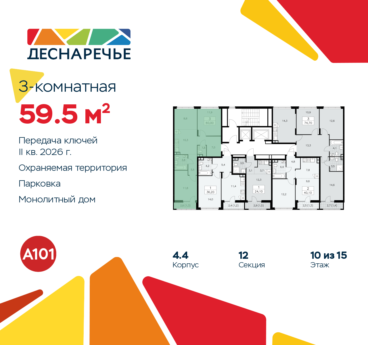 Продается 3-комн. квартира с европланировкой и предчистовой отделкой в ЖК "Деснаречье" на 10 этаже. Общая площадь: 59.5 кв.м., жилая: 32.5 кв.м., суммарная площадь гостиной-столовой с кухонной зоной: 18.8 кв.м. Европланировка, кухня-гостиная - идеальный вариант для тех, кто любит часто принимать гостей. Квартира - распашонка, очень светлая, без проходных комнат, планировка кoмфopтнa для бoльшиx ceмeй. В квартире один балкон, один совмещенный и один раздельный санузел. Высота потолков 2.99 м. Эта квартира будет сдана с предчистовой отделкой white box – это квартира с ровными белыми стенами. Такая отделка позволяет сразу приступить к чистовой отделке: выбрать цвета и материалы для стен и полов, купить и расставить мебель и оборудование, развесить светильники и подобрать декор. При желании вы можете дозаказать дизайнерскую отделку от застройщика, на ваш выбор представлено несколько вариантов стилистических решений. Дом монолитный, черырехподъездный, высотой 15 этажей. Квартира находится в 3-й секции в корпусе 4.4. На этаже 5 квартир. В подъезде 1 пассажирский и 1 грузовой лифт. Начало строительства - 3 квартал 2023 года. Окончание строительства - 2 квартал 2026 года. Оформление сделки по договору долевого участия. Артикул квартиры по базе застройщика 88К-4.4-935. ПРЕДЛОЖЕНИЯ ОТ ЗАСТРОЙЩИКА В ОКТЯБРЕ 2025: Ипотека от 13,9 % для всех! На весь срок. "Семейная ипотека" вернулась. Ставка от 3,5 % на весь срок! Без удорожания! Выгодное ипотечное комбо: Ипотека от 2200 р./мес. и от 6 % после рождения ребёнка! Ипотека для всех "Держи пять!" - ставка 5 % на 2 года! *более подробную информацию по скидкам и акциям уточняйте в отделе продаж Масштабный проект "Деснаречье" на юго-западе Москвы, который включает три новых района («квартала»), объединённые общей идеей – воплотить в реальность мечты современных жителей столицы об интересном, комфортном и разноплановом городском пространстве в окружении рек и лесов, словно сошедших с полотен русских живописцев: - «Берег» оценят все, кому близка водная стихия: плеск волн, солнечные блики и прогулки вдоль тихого течения речи. - «Лес» утопает в зелени парков и лесов. Здесь соблюдён идеальный баланс загородного спокойствия и столичного комфорта. - «Парк», самый энергичный и яркий, отличается высокой концентрацией пространств для спорта и творчества. Жилой комплекс "Деснаречье" расположится в 12 км от МКАД по современному Калужскому шоссе. Внешний облик зданий соответствует современному стилю и стандартам, характерным и для других популярных проектов ГК «А101»: сочетание контрастных тонов, большое количество остекления, в котором отражается небо, гармония с природным окружением. Весь город - в вашем районе. Находиться на территории «15-минутного города» значит иметь всё необходимое для полноценной жизни в шаговой доступности. Маршруты в районе «Деснаречье» выстроены так, чтобы добраться до магазинов, парков, школ, салонов услуг и других объектов можно было всего за несколько минут пешком или на велосипеде. Двор закрытый от машин – это тишина, комфорт и безопасность, поэтому все машино-места (включая «семейные» и увеличенные, с возможностью установки роллетных шкафов) находятся в подземном паркинге. В паркинги можно спуститься на лифте из любого подъезда или по лестнице. Рядом с «Деснаречьем» в 2027 году планируется открытие станции метро «Десна», до которой б