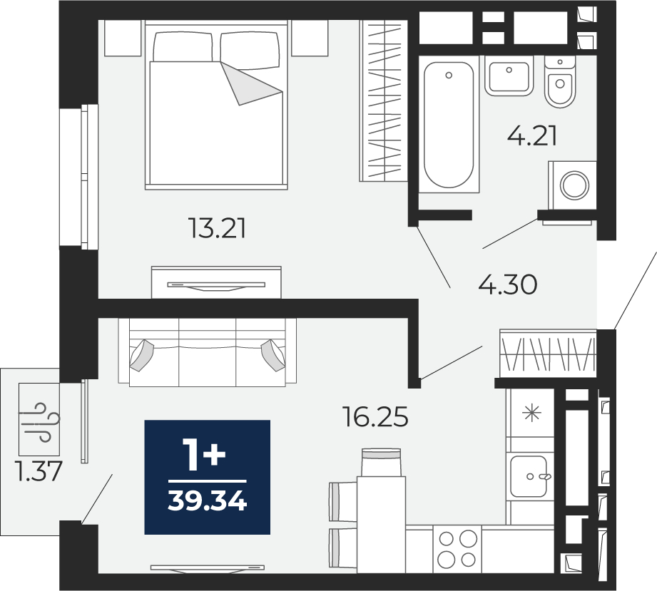 - Жилая площадь 13.21 м²