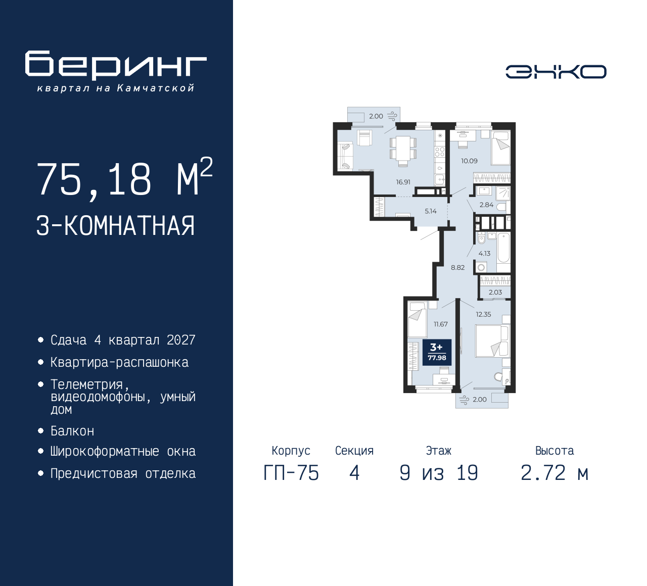 Трехкомнатная квартира от застройщика с предчистовой отделкой в ЖК "Беринг" на 9 этаже. Общая площадь: 75.18 кв.м., жилая: 34.11 кв.м., площадь просторной кухни-столовой: 16.91 кв.м. Квартира - распашонка, без проходных комнат, окна выходят на paзные стороны дома. В квартире два балкона, два совмещенных санузла. Высота потолков 2.72 м. Дом монолитный, многоподъездный, переменной этажности, от 17 до 24 этажей. Квартира находится в 4-й секции высотой 19 этажей в корпусе ГП-75. На этаже 4 квартиры. В подъезде 2 пассажирских и 1 грузовой лифт. Окончание строительства - 4 квартал 2027 года. Оформление сделки по договору долевого участия. Подобно знаменитому исследователю, мы чувствуем себя первооткрывателями этой локации. Хотим показать новую суть места, сформировать для вас жизненный опыт, которого ещё не было. Беринг — район зелёного цвета. Беринг — район, который откроется вам с другой стороны. Впечатлит новым уровнем комфорта и качеством жизни. Беринг — открытие на карте города. Первый квартал расположен в районе Тура, в границах улиц: Камчатская – Западносибирская – Энтузиастов. Вокруг уже есть всё для того, чтобы ежедневная рутина была лишь частью жизни и не доставляла дискомфорта. Школы и детские сады, магазины и аптеки, поликлиника, места для семейного отдыха, пеших и велопрогулок, и даже рыбалки. Масштабное озеленение дворов — визитная карточка ЭНКО и ваш оазис спокойствия, чтобы отвлечься от повседневности. Раскидистые деревья, кустарники, травы и цветы — осталось остановиться, вдохнуть и расслабиться, глядя на эту природную красоту. Стилистика подъездов продолжает концепцию Беринга, вдохновлённого Камчаткой: сдержанный, но при этом впечатляющий дизайн соседствует с удобством и функциональностью. (AQID02529781)