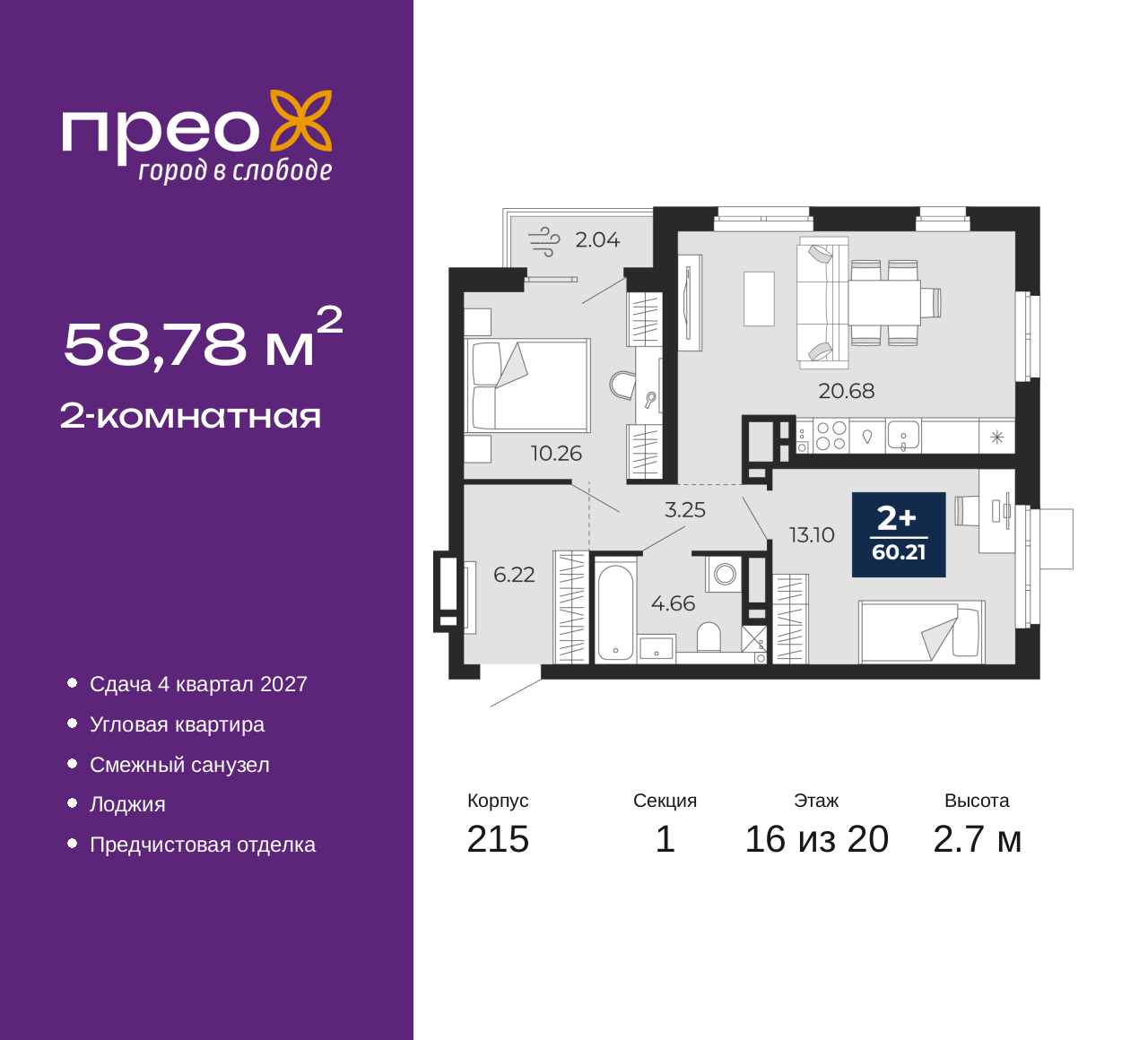 Просторная 2-комн. квартира с предчистовой отделкой в ЖК "Прео" на 16 этаже. Общая площадь: 58.78 кв.м., жилая: 23.36 кв.м., площадь просторной кухни-столовой: 20.68 кв.м. Квартира угловая, окна oбecпeчивaют paвнoмepнoe ocвeщeниe в тeчeниe дня. В квартире одна лоджия, один совмещенный санузел. Высота потолков 2.7 м. Квартира находится в корпусе 215. Дом монолитный, одноподъездный, высотой 20 этажей. На этаже 8 квартир. В подъезде 1 пассажирский и 1 грузовой лифт. Окончание строительства - 4 квартал 2027 года. Оформление сделки по договору долевого участия. Преображенский — один из самых привлекательных районов для жизни! Это полностью самостоятельный жилой район с точки зрения инфраструктуры. Преображенский находится между Московским и Червишевским трактами в квартале улиц Закалужская — Вьюжная — Александра Протозанова. Не нужно ждать, когда появится инфраструктура — переезжайте на всё готовое. Вблизи расположены действующие школа и детский сад. В этом году откроется еще один сад, а в следующем году — школа. По соседству с Преображенским запланировано строительство городского парка «Комарово» площадью 38 гектар. За 10 минут можно доехать на автомобиле до крупных ТРЦ: «Лента», «Кристалл», «Леруа Мерлен», «Метро» и «Ашан». С 2018 года в районе открыт Соседский центр — пространство, созданное для формирования добрососедской среды, совместного досуга, общения и реализации соседских инициатив. Здесь проходят встречи соседей, а также сами жители района организовывают мероприятия. Организатором такого события может стать любой желающий. В квартирах выполнена качественная предчистовая отделка. Гладкие стены с финишным выравниванием по маякам. Ровный потолок для установки натяжного потолка. Установлены пятикамерные окна с двойным стеклопакетом (3 стекла). Дизайнерские холлы с видеонаблюдением, безбарьерным и прозрачным входом – всегда светло и спокойно. На первом этаже есть просторные колясочные, где все жители могут оставлять свои коляски и велосипеды. В Преображенском есть всё, что нужно для активного отдыха и занятий спортом. Мы сделали большое футбольное поле с безопасным покрытием. Также установили хоккейный корт, который оборудован по всем необходимым стандартам. Во дворах можно делать упражнения на специальных площадках с турниками. Весь район мы обустроили велодорожками, которые связаны в единый маршрут. У нас есть сухие фонтаны, бьющие из земли, деревья, веревки, сетки, скалодром, газон, песок и резинка — осталось просто дать своему ребенку право на свободную игру. По-настоящему хорошие дворы — это те, которые дети предпочитают соцсетям и телевизору. Аккредитация в банках: «Сбербанк России», ПАО «Банк Уралсиб», ПАО «Газпромбанк», ПАО Банк «ВТБ», ОАО «Альфа-Банк» и других. (AQID02525535)