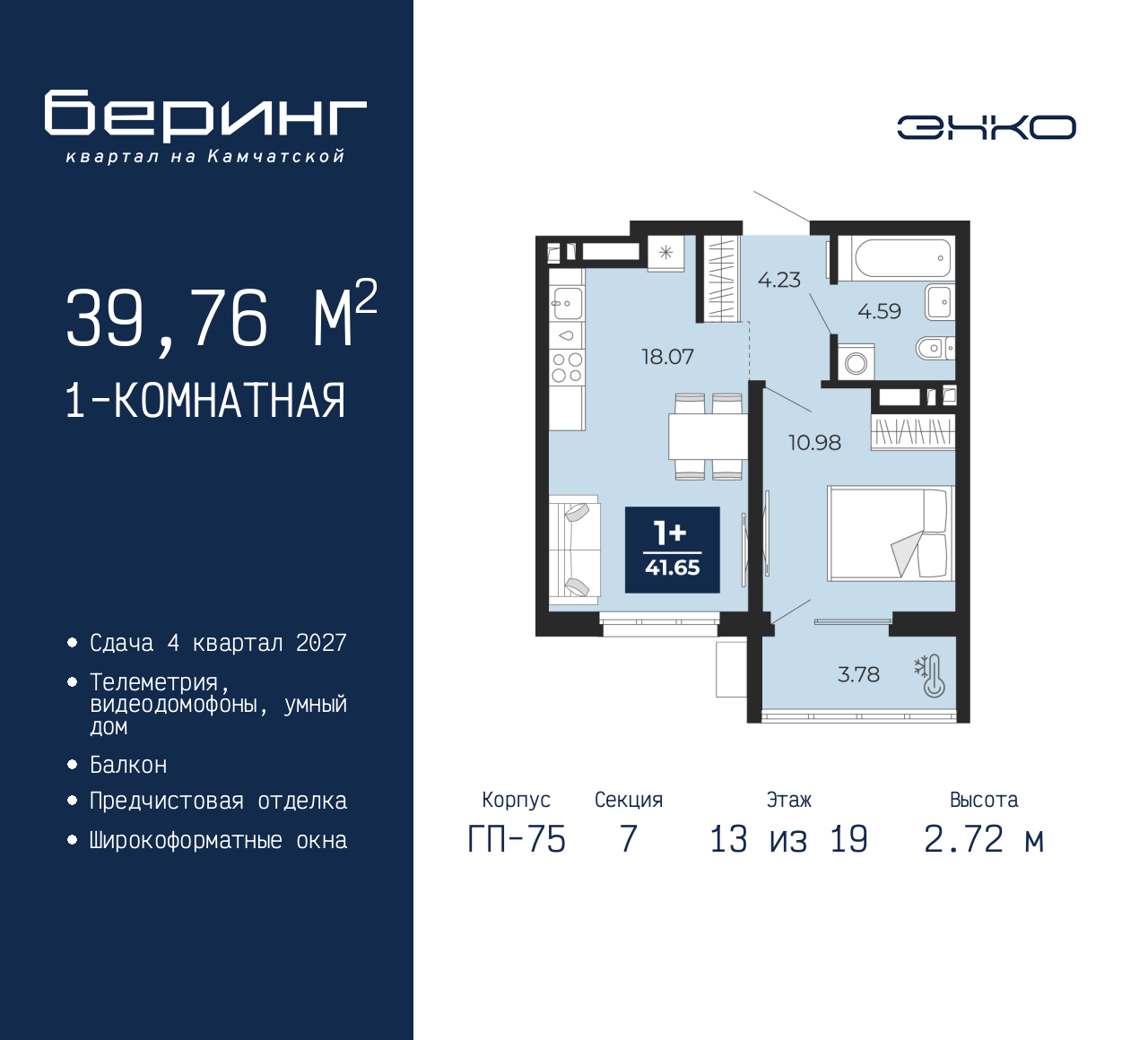 1-комн. квартира от застройщика с предчистовой отделкой в ЖК "Беринг" на 13 этаже. Общая площадь: 39.76 кв.м., жилая: 10.98 кв.м., площадь просторной кухни-столовой: 18.07 кв.м. Все окна выходят на одну сторону. В квартире один балкон, один совмещенный санузел. Высота потолков 2.72 м. Дом монолитный, многоподъездный, переменной этажности, от 17 до 24 этажей. Квартира находится в 7-й секции высотой 19 этажей в корпусе ГП-75. На этаже 7 квартир. В подъезде 2 пассажирских и 1 грузовой лифт. Окончание строительства - 4 квартал 2027 года. Оформление сделки по договору долевого участия. Подобно знаменитому исследователю, мы чувствуем себя первооткрывателями этой локации. Хотим показать новую суть места, сформировать для вас жизненный опыт, которого ещё не было. Беринг — район зелёного цвета. Беринг — район, который откроется вам с другой стороны. Впечатлит новым уровнем комфорта и качеством жизни. Беринг — открытие на карте города. Первый квартал расположен в районе Тура, в границах улиц: Камчатская – Западносибирская – Энтузиастов. Вокруг уже есть всё для того, чтобы ежедневная рутина была лишь частью жизни и не доставляла дискомфорта. Школы и детские сады, магазины и аптеки, поликлиника, места для семейного отдыха, пеших и велопрогулок, и даже рыбалки. Масштабное озеленение дворов — визитная карточка ЭНКО и ваш оазис спокойствия, чтобы отвлечься от повседневности. Раскидистые деревья, кустарники, травы и цветы — осталось остановиться, вдохнуть и расслабиться, глядя на эту природную красоту. Стилистика подъездов продолжает концепцию Беринга, вдохновлённого Камчаткой: сдержанный, но при этом впечатляющий дизайн соседствует с удобством и функциональностью. (AQID02529595)
