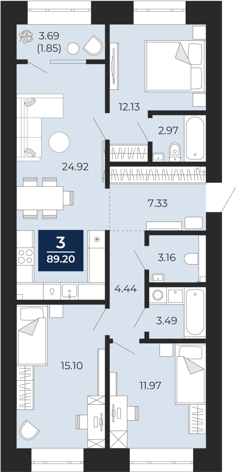 Продается трехкомнатная квартира с предчистовой отделкой в ЖК "Преображенский" на 2 этаже. Общая площадь: 87.36 кв.м., жилая: 39.2 кв.м., площадь просторной кухни-столовой: 24.92 кв.м. Квартира - распашонка, без проходных комнат, окна выходят на paзные стороны дома. В квартире одна лоджия, один совмещенный и один раздельный санузел. Высота потолков 2.7 м. Дом монолитный, многоподъездный, переменной этажности, от 8 до 12 этажей. Квартира находится в 4-й секции высотой 12 этажей в корпусе ГП-82. На этаже 6 квартир. В подъезде 1 пассажирский и 1 грузовой лифт. Окончание строительства - 3 квартал 2026 года. Оформление сделки по договору долевого участия. Квартал будет расположен в микрорайоне Славянский на пересечении улиц Мира и 70-летия Октября. Престижный район, собственный парк, вся необходимая для жизни, учёбы и работы инфраструктура — новая школа с бассейном и кванториумом, новый детский сад, поликлиника, спорткомплекс, магазины и др. Чтобы в квартирах было как можно больше свободного пространства, мы предусмотрели индивидуальные кладовые на цокольном этаже. Оставляйте коляски и сезонный спортинвентарь после прогулок здесь — удобно для вас и чисто для квартиры. В подземный паркинг можно спуститься на лифте прямо с квартирной площадки. (AQID02484139)
