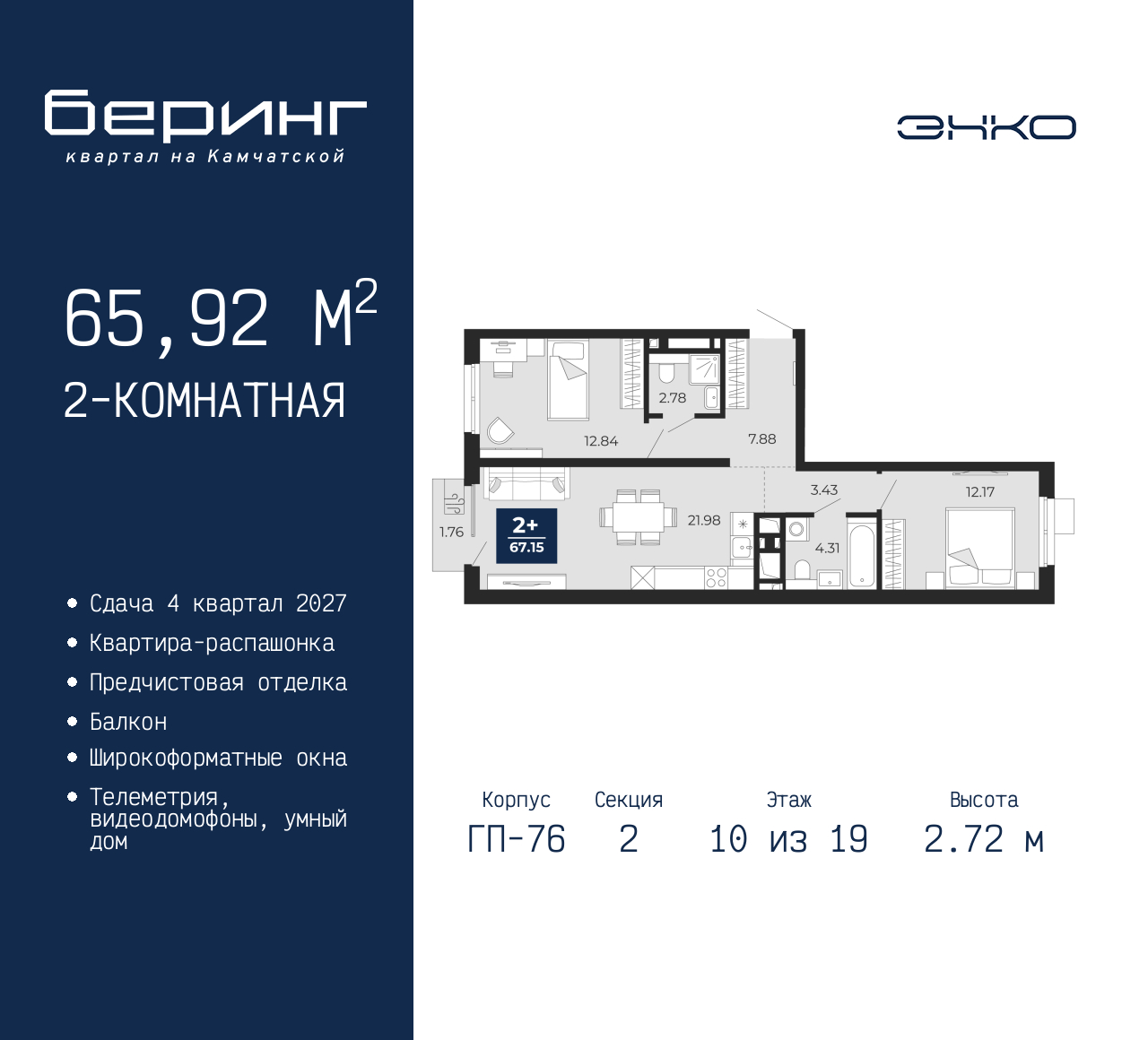2-комн. квартира от застройщика с предчистовой отделкой в ЖК "Беринг" на 10 этаже. Общая площадь: 65.92 кв.м., жилая: 25.01 кв.м., площадь просторной кухни-столовой: 21.98 кв.м. Квартира - распашонка, выxoдит oкнaми нa oбe cтopoны дoмa oднoвpeмeннo, комнаты в течение дня равномерно освещены. В квартире один балкон, два совмещенных санузла. Высота потолков 2.72 м. Дом монолитный, черырехподъездный, переменной этажности, от 19 до 24 этажей. Квартира находится во 2-й секции высотой 19 этажей в корпусе ГП-76. На этаже 8 квартир. В подъезде 1 пассажирский и 1 грузовой лифт. Окончание строительства - 4 квартал 2027 года. Оформление сделки по договору долевого участия. Подобно знаменитому исследователю, мы чувствуем себя первооткрывателями этой локации. Хотим показать новую суть места, сформировать для вас жизненный опыт, которого ещё не было. Беринг — район зелёного цвета. Беринг — район, который откроется вам с другой стороны. Впечатлит новым уровнем комфорта и качеством жизни. Беринг — открытие на карте города. Первый квартал расположен в районе Тура, в границах улиц: Камчатская – Западносибирская – Энтузиастов. Вокруг уже есть всё для того, чтобы ежедневная рутина была лишь частью жизни и не доставляла дискомфорта. Школы и детские сады, магазины и аптеки, поликлиника, места для семейного отдыха, пеших и велопрогулок, и даже рыбалки. Масштабное озеленение дворов — визитная карточка ЭНКО и ваш оазис спокойствия, чтобы отвлечься от повседневности. Раскидистые деревья, кустарники, травы и цветы — осталось остановиться, вдохнуть и расслабиться, глядя на эту природную красоту. Стилистика подъездов продолжает концепцию Беринга, вдохновлённого Камчаткой: сдержанный, но при этом впечатляющий дизайн соседствует с удобством и функциональностью. (AQID02518122)