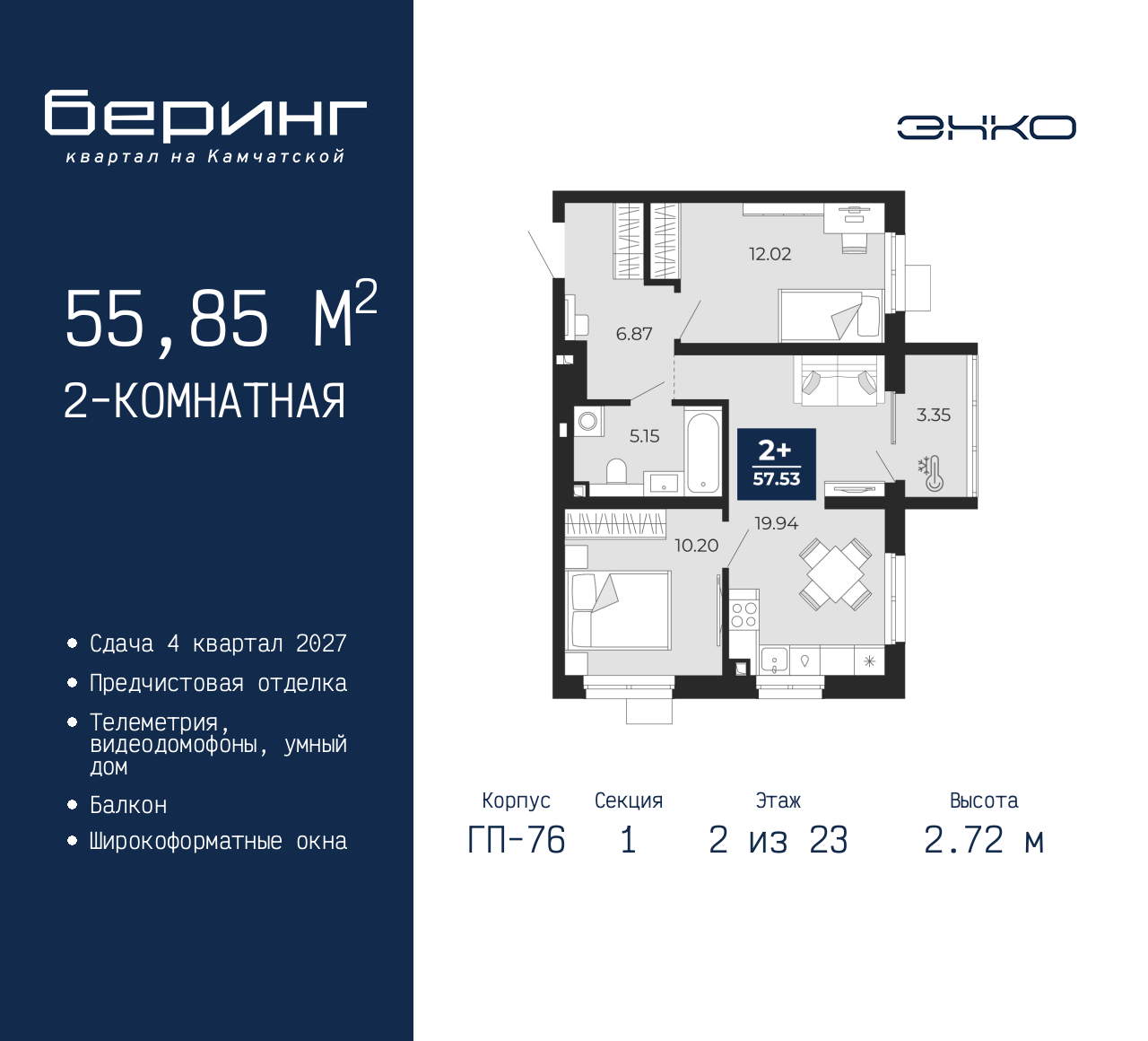 2-комн. квартира с предчистовой отделкой в ЖК "Беринг" на 2 этаже. Общая площадь: 55.85 кв.м., жилая: 22.22 кв.м., площадь просторной кухни-столовой: 19.94 кв.м. Квартира угловая, идеально подойдет любителям тишины и панорамных видов. В квартире один балкон, один совмещенный санузел. Высота потолков 2.72 м. Дом монолитный, черырехподъездный, переменной этажности, от 19 до 24 этажей. Квартира находится в 1-й секции высотой 23 этажа в корпусе ГП-76. На этаже 7 квартир. В подъезде 2 пассажирских и 1 грузовой лифт. Окончание строительства - 4 квартал 2027 года. Оформление сделки по договору долевого участия. Подобно знаменитому исследователю, мы чувствуем себя первооткрывателями этой локации. Хотим показать новую суть места, сформировать для вас жизненный опыт, которого ещё не было. Беринг — район зелёного цвета. Беринг — район, который откроется вам с другой стороны. Впечатлит новым уровнем комфорта и качеством жизни. Беринг — открытие на карте города. Первый квартал расположен в районе Тура, в границах улиц: Камчатская – Западносибирская – Энтузиастов. Вокруг уже есть всё для того, чтобы ежедневная рутина была лишь частью жизни и не доставляла дискомфорта. Школы и детские сады, магазины и аптеки, поликлиника, места для семейного отдыха, пеших и велопрогулок, и даже рыбалки. Масштабное озеленение дворов — визитная карточка ЭНКО и ваш оазис спокойствия, чтобы отвлечься от повседневности. Раскидистые деревья, кустарники, травы и цветы — осталось остановиться, вдохнуть и расслабиться, глядя на эту природную красоту. Стилистика подъездов продолжает концепцию Беринга, вдохновлённого Камчаткой: сдержанный, но при этом впечатляющий дизайн соседствует с удобством и функциональностью. (AQID02517976)