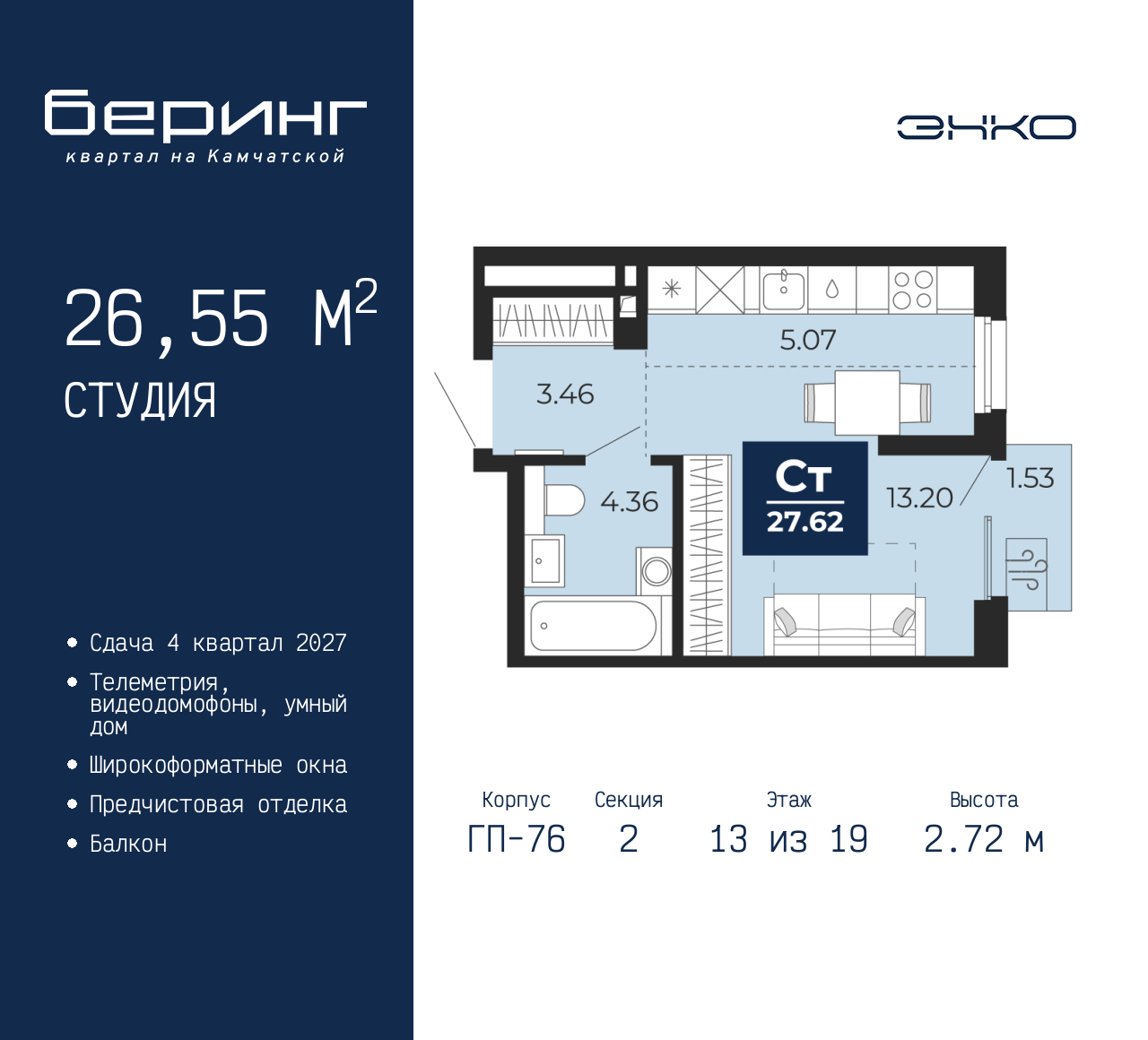 1-комн. квартира-студия от застройщика с предчистовой отделкой в ЖК "Беринг" на 13 этаже. Общая площадь: 26.55 кв.м., площадь гостиной 18.27 кв.м., из которых 5.07 кв.м. выделено под кухонную зону. Все окна выходят на одну сторону. В квартире один балкон, один совмещенный санузел. Высота потолков 2.72 м. Дом монолитный, черырехподъездный, переменной этажности, от 19 до 24 этажей. Квартира находится во 2-й секции высотой 19 этажей в корпусе ГП-76. На этаже 8 квартир. В подъезде 1 пассажирский и 1 грузовой лифт. Окончание строительства - 4 квартал 2027 года. Оформление сделки по договору долевого участия. Подобно знаменитому исследователю, мы чувствуем себя первооткрывателями этой локации. Хотим показать новую суть места, сформировать для вас жизненный опыт, которого ещё не было. Беринг — район зелёного цвета. Беринг — район, который откроется вам с другой стороны. Впечатлит новым уровнем комфорта и качеством жизни. Беринг — открытие на карте города. Первый квартал расположен в районе Тура, в границах улиц: Камчатская – Западносибирская – Энтузиастов. Вокруг уже есть всё для того, чтобы ежедневная рутина была лишь частью жизни и не доставляла дискомфорта. Школы и детские сады, магазины и аптеки, поликлиника, места для семейного отдыха, пеших и велопрогулок, и даже рыбалки. Масштабное озеленение дворов — визитная карточка ЭНКО и ваш оазис спокойствия, чтобы отвлечься от повседневности. Раскидистые деревья, кустарники, травы и цветы — осталось остановиться, вдохнуть и расслабиться, глядя на эту природную красоту. Стилистика подъездов продолжает концепцию Беринга, вдохновлённого Камчаткой: сдержанный, но при этом впечатляющий дизайн соседствует с удобством и функциональностью. (AQID02518137)