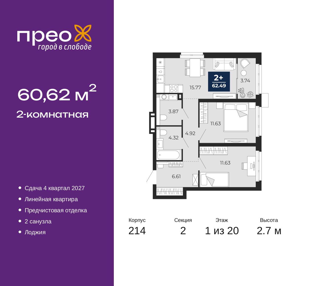 Продается 2-комн. квартира с предчистовой отделкой в ЖК "Прео" на 1 этаже. Общая площадь: 60.62 кв.м., жилая: 23.26 кв.м., площадь просторной кухни-столовой: 15.77 кв.м. Комнаты изолированные, все окна выходят на одну сторону. В квартире одна лоджия, один совмещенный и один раздельный санузел. Высота потолков 2.7 м. Дом монолитный, двухподъездный, переменной этажности, от 12 до 20 этажей. Квартира находится во 2-й секции высотой 20 этажей в корпусе 214. На этаже 8 квартир. В подъезде 1 пассажирский и 1 грузовой лифт. Окончание строительства - 4 квартал 2027 года. Оформление сделки по договору долевого участия. Преображенский — один из самых привлекательных районов для жизни! Это полностью самостоятельный жилой район с точки зрения инфраструктуры. Преображенский находится между Московским и Червишевским трактами в квартале улиц Закалужская — Вьюжная — Александра Протозанова. Не нужно ждать, когда появится инфраструктура — переезжайте на всё готовое. Вблизи расположены действующие школа и детский сад. В этом году откроется еще один сад, а в следующем году — школа. По соседству с Преображенским запланировано строительство городского парка «Комарово» площадью 38 гектар. За 10 минут можно доехать на автомобиле до крупных ТРЦ: «Лента», «Кристалл», «Леруа Мерлен», «Метро» и «Ашан». С 2018 года в районе открыт Соседский центр — пространство, созданное для формирования добрососедской среды, совместного досуга, общения и реализации соседских инициатив. Здесь проходят встречи соседей, а также сами жители района организовывают мероприятия. Организатором такого события может стать любой желающий. В квартирах выполнена качественная предчистовая отделка. Гладкие стены с финишным выравниванием по маякам. Ровный потолок для установки натяжного потолка. Установлены пятикамерные окна с двойным стеклопакетом (3 стекла). Дизайнерские холлы с видеонаблюдением, безбарьерным и прозрачным входом – всегда светло и спокойно. На первом этаже есть просторные колясочные, где все жители могут оставлять свои коляски и велосипеды. В Преображенском есть всё, что нужно для активного отдыха и занятий спортом. Мы сделали большое футбольное поле с безопасным покрытием. Также установили хоккейный корт, который оборудован по всем необходимым стандартам. Во дворах можно делать упражнения на специальных площадках с турниками. Весь район мы обустроили велодорожками, которые связаны в единый маршрут. У нас есть сухие фонтаны, бьющие из земли, деревья, веревки, сетки, скалодром, газон, песок и резинка — осталось просто дать своему ребенку право на свободную игру. По-настоящему хорошие дворы — это те, которые дети предпочитают соцсетям и телевизору. Аккредитация в банках: ПАО «Газпромбанк», ПАО Банк «ВТБ», ОАО «Альфа-Банк», ПАО «Банк Уралсиб», «Сбербанк России» и других. (AQID02525536)
