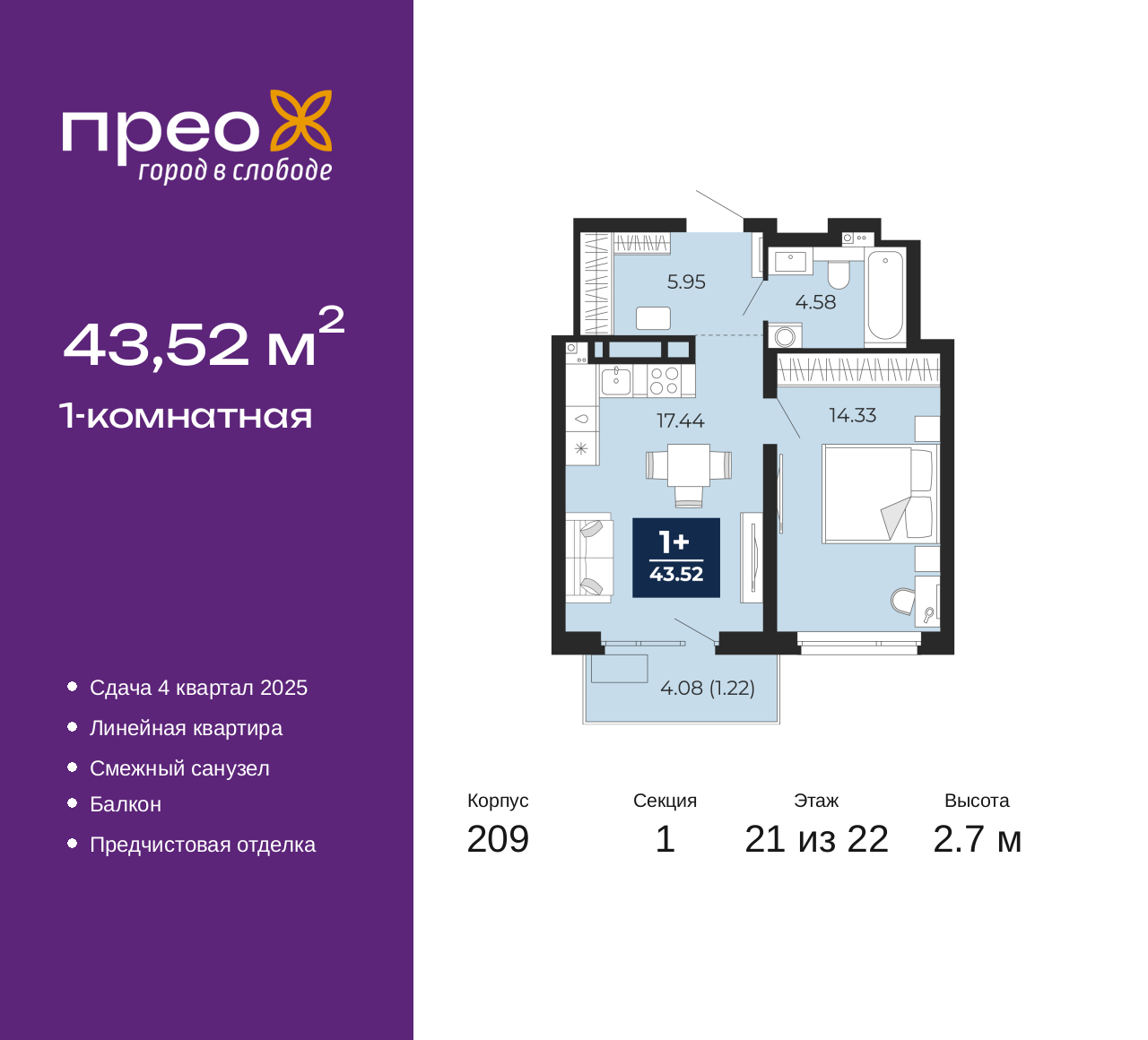 Однокомнатная квартира с предчистовой отделкой в ЖК "Прео" на 21 этаже. Общая площадь: 43.52 кв.м., жилая: 14.33 кв.м., площадь просторной кухни-столовой: 17.44 кв.м. Все окна выходят на одну сторону. В квартире один балкон, один совмещенный санузел. Высота потолков 2.7 м. Квартира находится в корпусе 209. Дом монолитный, одноподъездный, высотой 22 этажа. На этаже 8 квартир. В подъезде 1 пассажирский и 1 грузовой лифт. Окончание строительства - 4 квартал 2025 года. Оформление сделки по договору долевого участия. Преображенский — один из самых привлекательных районов для жизни! Это полностью самостоятельный жилой район с точки зрения инфраструктуры. Преображенский находится между Московским и Червишевским трактами в квартале улиц Закалужская — Вьюжная — Александра Протозанова. Не нужно ждать, когда появится инфраструктура — переезжайте на всё готовое. Вблизи расположены действующие школа и детский сад. В этом году откроется еще один сад, а в следующем году — школа. По соседству с Преображенским запланировано строительство городского парка «Комарово» площадью 38 гектар. За 10 минут можно доехать на автомобиле до крупных ТРЦ: «Лента», «Кристалл», «Леруа Мерлен», «Метро» и «Ашан». С 2018 года в районе открыт Соседский центр — пространство, созданное для формирования добрососедской среды, совместного досуга, общения и реализации соседских инициатив. Здесь проходят встречи соседей, а также сами жители района организовывают мероприятия. Организатором такого события может стать любой желающий. В квартирах выполнена качественная предчистовая отделка. Гладкие стены с финишным выравниванием по маякам. Ровный потолок для установки натяжного потолка. Установлены пятикамерные окна с двойным стеклопакетом (3 стекла). Дизайнерские холлы с видеонаблюдением, безбарьерным и прозрачным входом – всегда светло и спокойно. На первом этаже есть просторные колясочные, где все жители могут оставлять свои коляски и велосипеды. В Преображенском есть всё, что нужно для активного отдыха и занятий спортом. Мы сделали большое футбольное поле с безопасным покрытием. Также установили хоккейный корт, который оборудован по всем необходимым стандартам. Во дворах можно делать упражнения на специальных площадках с турниками. Весь район мы обустроили велодорожками, которые связаны в единый маршрут. У нас есть сухие фонтаны, бьющие из земли, деревья, веревки, сетки, скалодром, газон, песок и резинка — осталось просто дать своему ребенку право на свободную игру. По-настоящему хорошие дворы — это те, которые дети предпочитают соцсетям и телевизору. (AQID02525914)