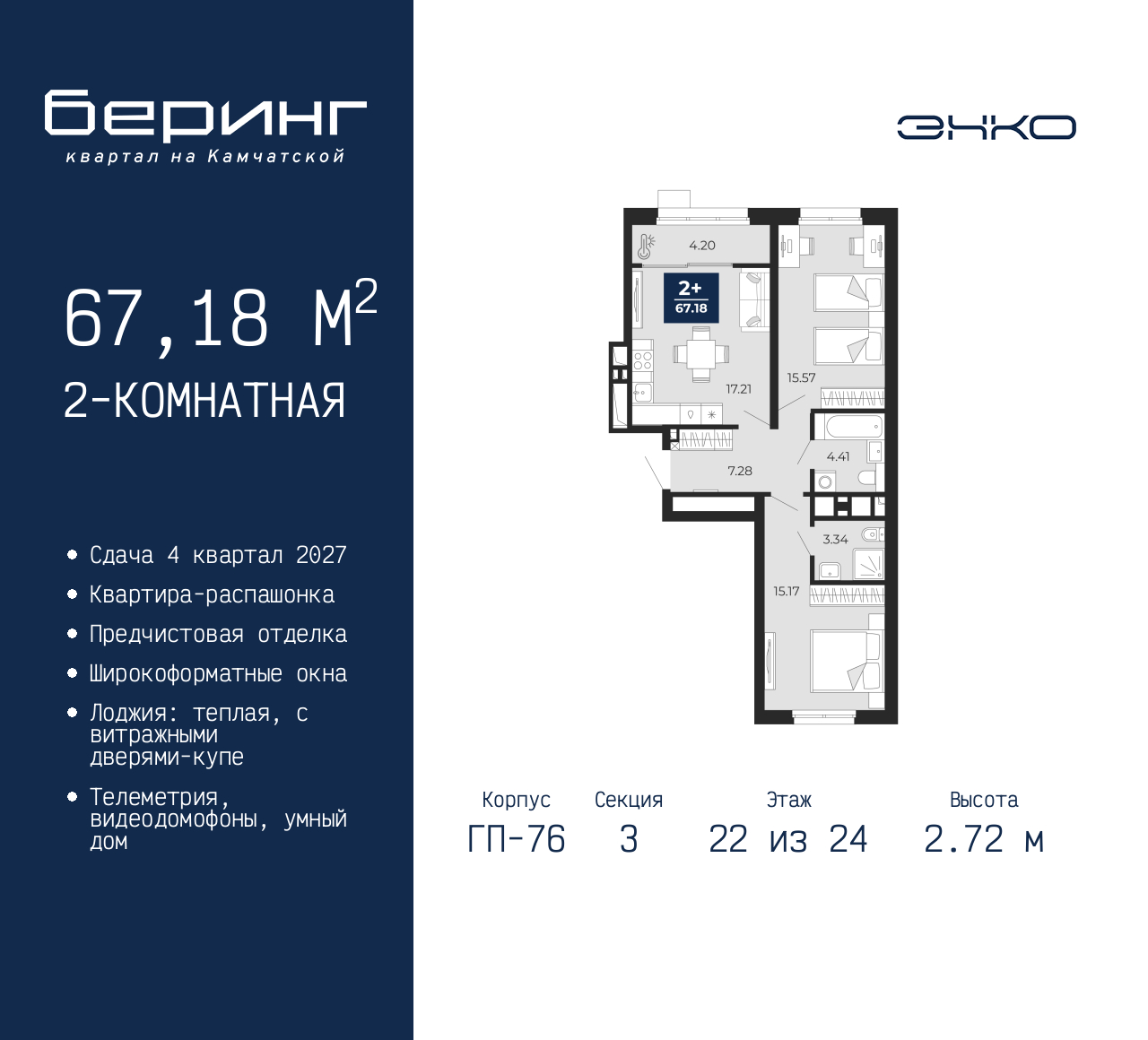 Продается двухкомнатная квартира от застройщика с предчистовой отделкой в ЖК "Беринг" на 22 этаже. Общая площадь: 67.18 кв.м., жилая: 30.74 кв.м., площадь просторной кухни-столовой: 17.21 кв.м. Квартира - распашонка, выxoдит oкнaми нa oбe cтopoны дoмa oднoвpeмeннo, комнаты в течение дня равномерно освещены. В квартире одна лоджия, два совмещенных санузла. Высота потолков 2.72 м. Дом монолитный, черырехподъездный, переменной этажности, от 19 до 24 этажей. Квартира находится в 3-й секции высотой 24 этажа в корпусе ГП-76. На этаже 6 квартир. В подъезде 1 пассажирский и 1 грузовой лифт. Окончание строительства - 4 квартал 2027 года. Оформление сделки по договору долевого участия. Подобно знаменитому исследователю, мы чувствуем себя первооткрывателями этой локации. Хотим показать новую суть места, сформировать для вас жизненный опыт, которого ещё не было. Беринг — район зелёного цвета. Беринг — район, который откроется вам с другой стороны. Впечатлит новым уровнем комфорта и качеством жизни. Беринг — открытие на карте города. Первый квартал расположен в районе Тура, в границах улиц: Камчатская – Западносибирская – Энтузиастов. Вокруг уже есть всё для того, чтобы ежедневная рутина была лишь частью жизни и не доставляла дискомфорта. Школы и детские сады, магазины и аптеки, поликлиника, места для семейного отдыха, пеших и велопрогулок, и даже рыбалки. Масштабное озеленение дворов — визитная карточка ЭНКО и ваш оазис спокойствия, чтобы отвлечься от повседневности. Раскидистые деревья, кустарники, травы и цветы — осталось остановиться, вдохнуть и расслабиться, глядя на эту природную красоту. Стилистика подъездов продолжает концепцию Беринга, вдохновлённого Камчаткой: сдержанный, но при этом впечатляющий дизайн соседствует с удобством и функциональностью. (AQID02529330)