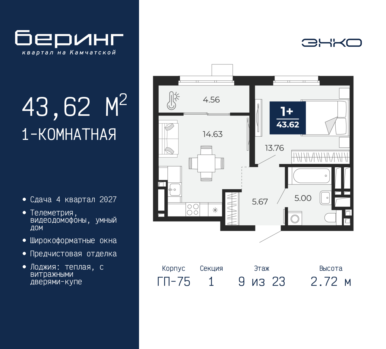 Просторная 1-комн. квартира с предчистовой отделкой в ЖК "Беринг" на 9 этаже. Общая площадь: 43.62 кв.м., жилая: 13.76 кв.м., площадь просторной кухни-столовой: 14.63 кв.м. Все окна выходят на одну сторону. В квартире одна лоджия, один совмещенный санузел. Высота потолков 2.72 м. Дом монолитный, многоподъездный, переменной этажности, от 17 до 24 этажей. Квартира находится в 1-й секции высотой 23 этажа в корпусе ГП-75. На этаже 8 квартир. В подъезде 2 пассажирских и 1 грузовой лифт. Окончание строительства - 4 квартал 2027 года. Оформление сделки по договору долевого участия. Подобно знаменитому исследователю, мы чувствуем себя первооткрывателями этой локации. Хотим показать новую суть места, сформировать для вас жизненный опыт, которого ещё не было. Беринг — район зелёного цвета. Беринг — район, который откроется вам с другой стороны. Впечатлит новым уровнем комфорта и качеством жизни. Беринг — открытие на карте города. Первый квартал расположен в районе Тура, в границах улиц: Камчатская – Западносибирская – Энтузиастов. Вокруг уже есть всё для того, чтобы ежедневная рутина была лишь частью жизни и не доставляла дискомфорта. Школы и детские сады, магазины и аптеки, поликлиника, места для семейного отдыха, пеших и велопрогулок, и даже рыбалки. Масштабное озеленение дворов — визитная карточка ЭНКО и ваш оазис спокойствия, чтобы отвлечься от повседневности. Раскидистые деревья, кустарники, травы и цветы — осталось остановиться, вдохнуть и расслабиться, глядя на эту природную красоту. Стилистика подъездов продолжает концепцию Беринга, вдохновлённого Камчаткой: сдержанный, но при этом впечатляющий дизайн соседствует с удобством и функциональностью. (AQID02529617)