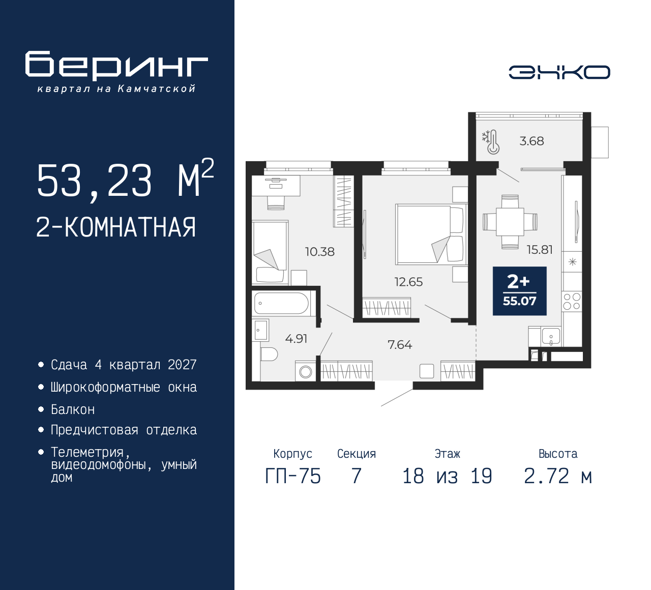 2-комн. квартира от застройщика с предчистовой отделкой в ЖК "Беринг" на 18 этаже. Общая площадь: 53.23 кв.м., жилая: 23.03 кв.м., площадь просторной кухни-столовой: 15.81 кв.м. Комнаты изолированные, все окна выходят на одну сторону. В квартире один балкон, один совмещенный санузел. Высота потолков 2.72 м. Дом монолитный, многоподъездный, переменной этажности, от 17 до 24 этажей. Квартира находится в 7-й секции высотой 19 этажей в корпусе ГП-75. На этаже 7 квартир. В подъезде 2 пассажирских и 1 грузовой лифт. Окончание строительства - 4 квартал 2027 года. Оформление сделки по договору долевого участия. Подобно знаменитому исследователю, мы чувствуем себя первооткрывателями этой локации. Хотим показать новую суть места, сформировать для вас жизненный опыт, которого ещё не было. Беринг — район зелёного цвета. Беринг — район, который откроется вам с другой стороны. Впечатлит новым уровнем комфорта и качеством жизни. Беринг — открытие на карте города. Первый квартал расположен в районе Тура, в границах улиц: Камчатская – Западносибирская – Энтузиастов. Вокруг уже есть всё для того, чтобы ежедневная рутина была лишь частью жизни и не доставляла дискомфорта. Школы и детские сады, магазины и аптеки, поликлиника, места для семейного отдыха, пеших и велопрогулок, и даже рыбалки. Масштабное озеленение дворов — визитная карточка ЭНКО и ваш оазис спокойствия, чтобы отвлечься от повседневности. Раскидистые деревья, кустарники, травы и цветы — осталось остановиться, вдохнуть и расслабиться, глядя на эту природную красоту. Стилистика подъездов продолжает концепцию Беринга, вдохновлённого Камчаткой: сдержанный, но при этом впечатляющий дизайн соседствует с удобством и функциональностью. (AQID02529673)