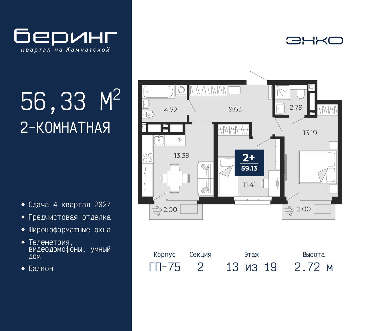 Просторная двухкомнатная квартира с предчистовой отделкой в ЖК "Беринг" на 13 этаже. Общая площадь: 56.33 кв.м., жилая: 24.6 кв.м., площадь просторной кухни-столовой: 13.39 кв.м. Комнаты изолированные, все окна выходят на одну сторону. В квартире два балкона, два совмещенных санузла. Высота потолков 2.72 м. Дом монолитный, многоподъездный, переменной этажности, от 17 до 24 этажей. Квартира находится во 2-й секции высотой 19 этажей в корпусе ГП-75. На этаже 7 квартир. В подъезде 2 пассажирских и 1 грузовой лифт. Окончание строительства - 4 квартал 2027 года. Оформление сделки по договору долевого участия. Подобно знаменитому исследователю, мы чувствуем себя первооткрывателями этой локации. Хотим показать новую суть места, сформировать для вас жизненный опыт, которого ещё не было. Беринг — район зелёного цвета. Беринг — район, который откроется вам с другой стороны. Впечатлит новым уровнем комфорта и качеством жизни. Беринг — открытие на карте города. Первый квартал расположен в районе Тура, в границах улиц: Камчатская – Западносибирская – Энтузиастов. Вокруг уже есть всё для того, чтобы ежедневная рутина была лишь частью жизни и не доставляла дискомфорта. Школы и детские сады, магазины и аптеки, поликлиника, места для семейного отдыха, пеших и велопрогулок, и даже рыбалки. Масштабное озеленение дворов — визитная карточка ЭНКО и ваш оазис спокойствия, чтобы отвлечься от повседневности. Раскидистые деревья, кустарники, травы и цветы — осталось остановиться, вдохнуть и расслабиться, глядя на эту природную красоту. Стилистика подъездов продолжает концепцию Беринга, вдохновлённого Камчаткой: сдержанный, но при этом впечатляющий дизайн соседствует с удобством и функциональностью. (AQID02529694)