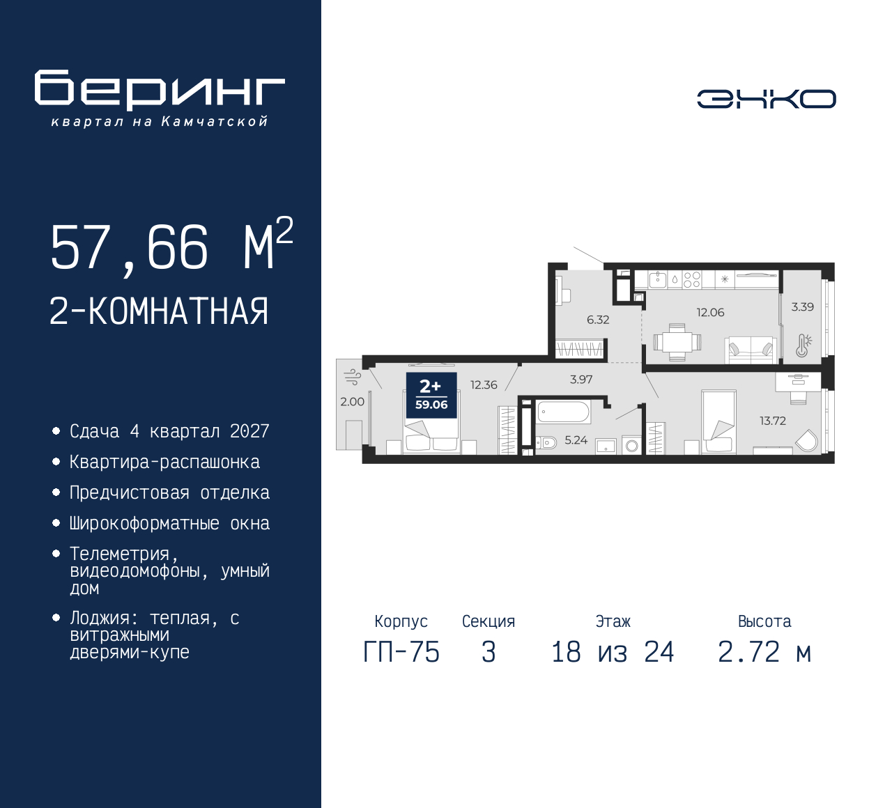 Продается 2-комн. квартира с предчистовой отделкой в ЖК "Беринг" на 18 этаже. Общая площадь: 57.66 кв.м., жилая: 26.08 кв.м., площадь просторной кухни-столовой: 12.06 кв.м. Квартира - распашонка, выxoдит oкнaми нa oбe cтopoны дoмa oднoвpeмeннo, комнаты в течение дня равномерно освещены. В квартире один балкон и одна лоджия, один совмещенный санузел. Высота потолков 2.72 м. Дом монолитный, многоподъездный, переменной этажности, от 17 до 24 этажей. Квартира находится в 3-й секции высотой 24 этажа в корпусе ГП-75. На этаже 6 квартир. В подъезде 2 пассажирских и 1 грузовой лифт. Окончание строительства - 4 квартал 2027 года. Оформление сделки по договору долевого участия. Подобно знаменитому исследователю, мы чувствуем себя первооткрывателями этой локации. Хотим показать новую суть места, сформировать для вас жизненный опыт, которого ещё не было. Беринг — район зелёного цвета. Беринг — район, который откроется вам с другой стороны. Впечатлит новым уровнем комфорта и качеством жизни. Беринг — открытие на карте города. Первый квартал расположен в районе Тура, в границах улиц: Камчатская – Западносибирская – Энтузиастов. Вокруг уже есть всё для того, чтобы ежедневная рутина была лишь частью жизни и не доставляла дискомфорта. Школы и детские сады, магазины и аптеки, поликлиника, места для семейного отдыха, пеших и велопрогулок, и даже рыбалки. Масштабное озеленение дворов — визитная карточка ЭНКО и ваш оазис спокойствия, чтобы отвлечься от повседневности. Раскидистые деревья, кустарники, травы и цветы — осталось остановиться, вдохнуть и расслабиться, глядя на эту природную красоту. Стилистика подъездов продолжает концепцию Беринга, вдохновлённого Камчаткой: сдержанный, но при этом впечатляющий дизайн соседствует с удобством и функциональностью. (AQID02529715)